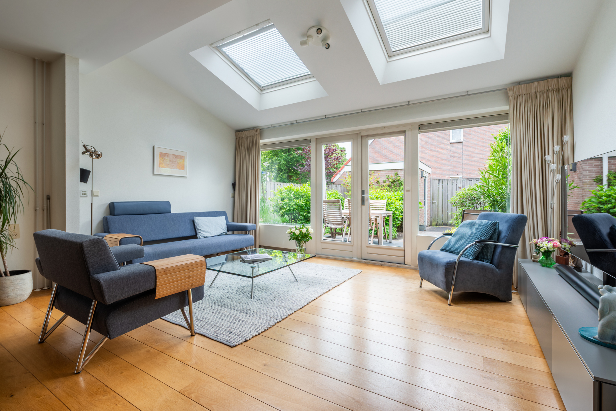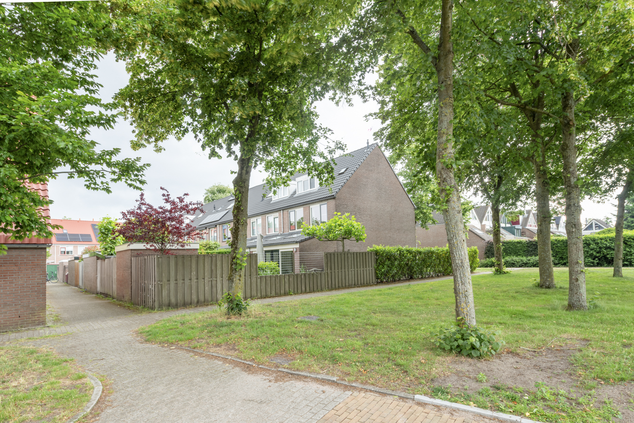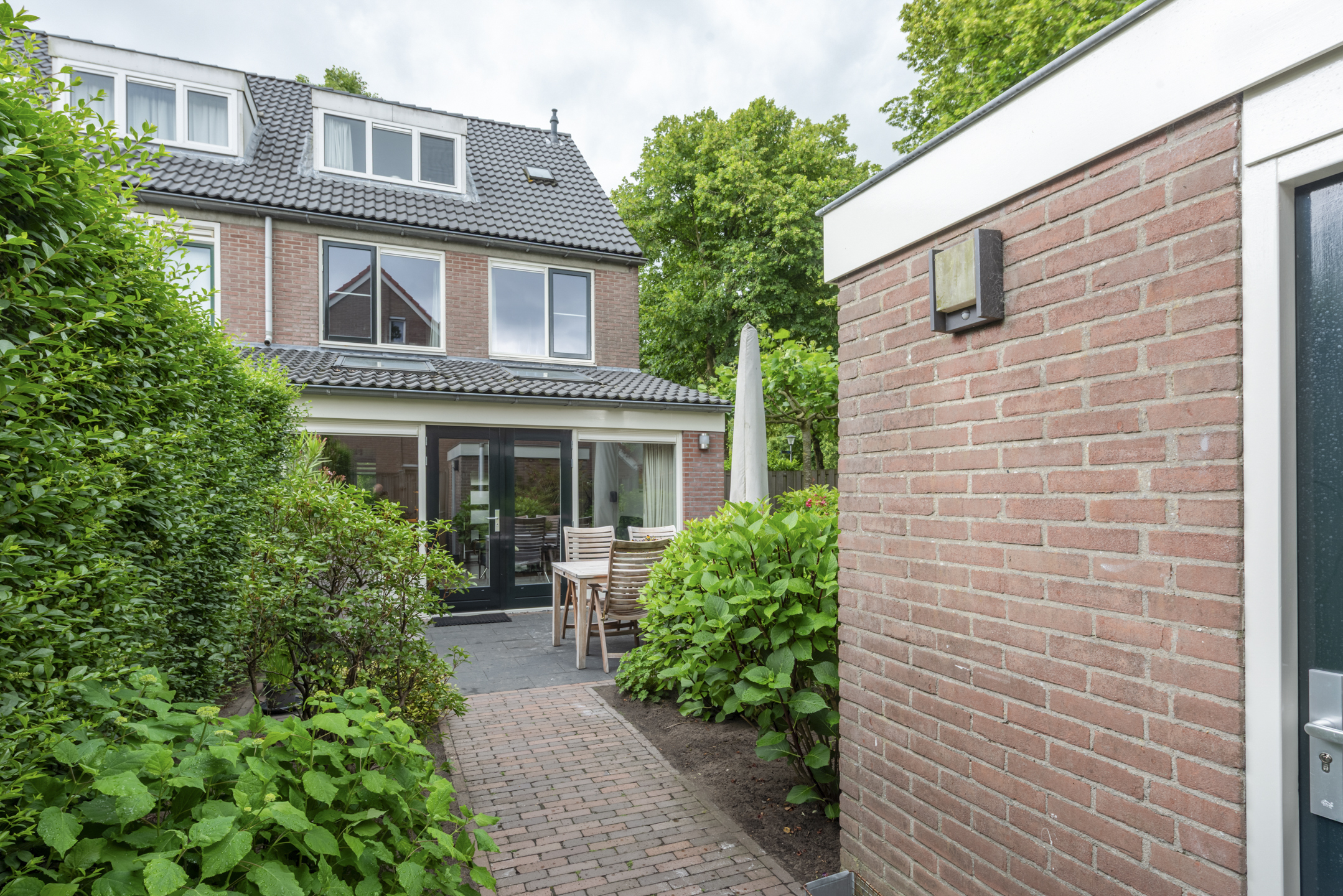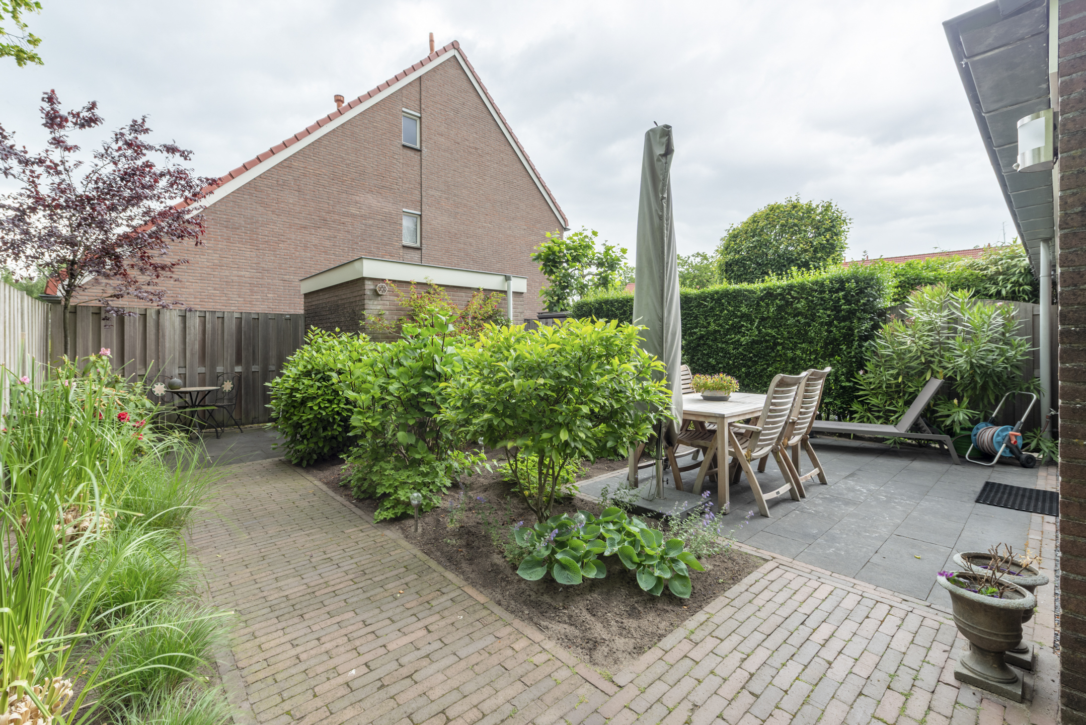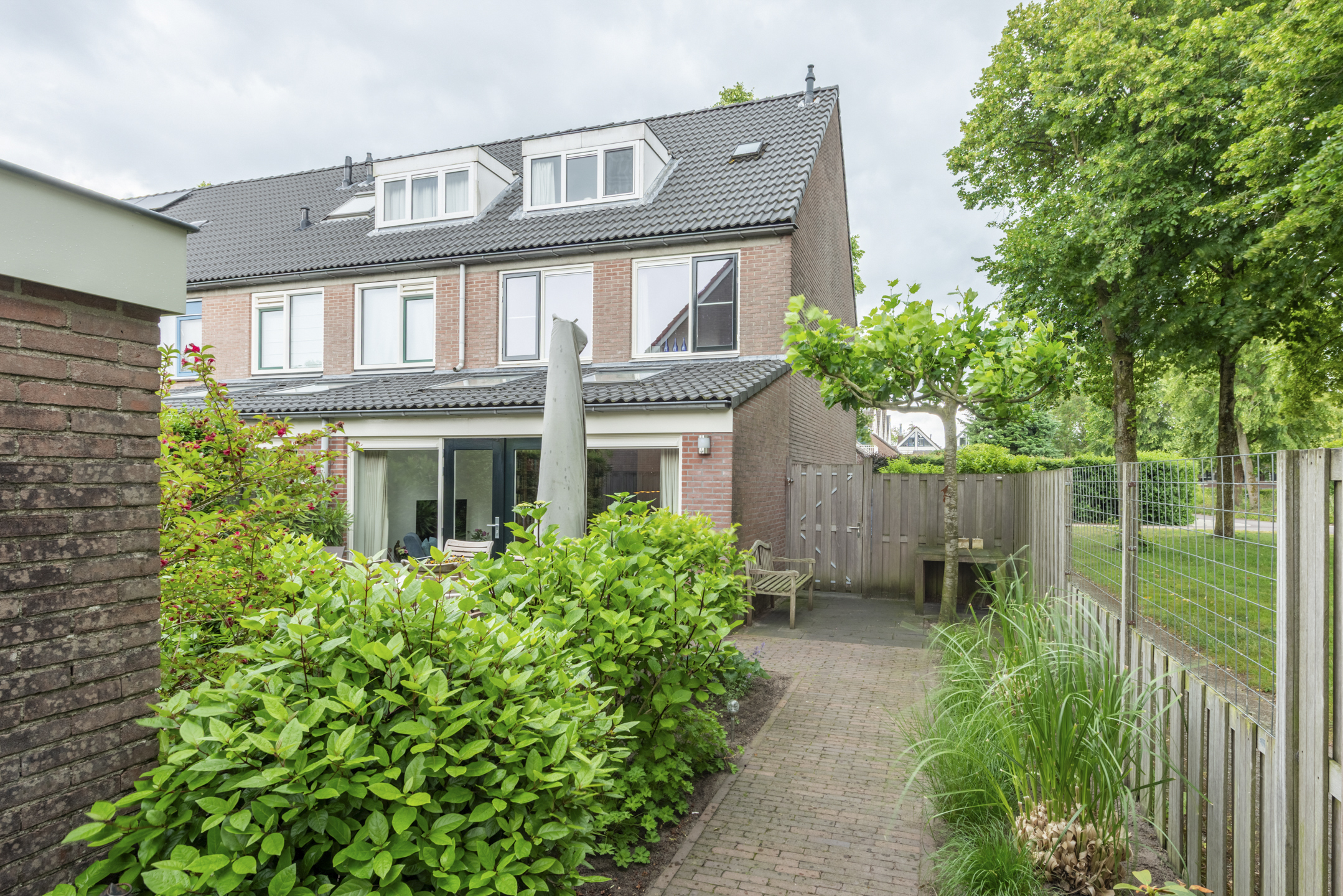 Mooi aangelegde en zonnige tuin rondom het huis. De achtertuin ligt op het westen en heeft een stenen schuurtje. Het zij-perceel is ca 3,5 meter breed en biedt veel extra mogelijkheden om te gebruiken of mogelijk aan te bouwen.
