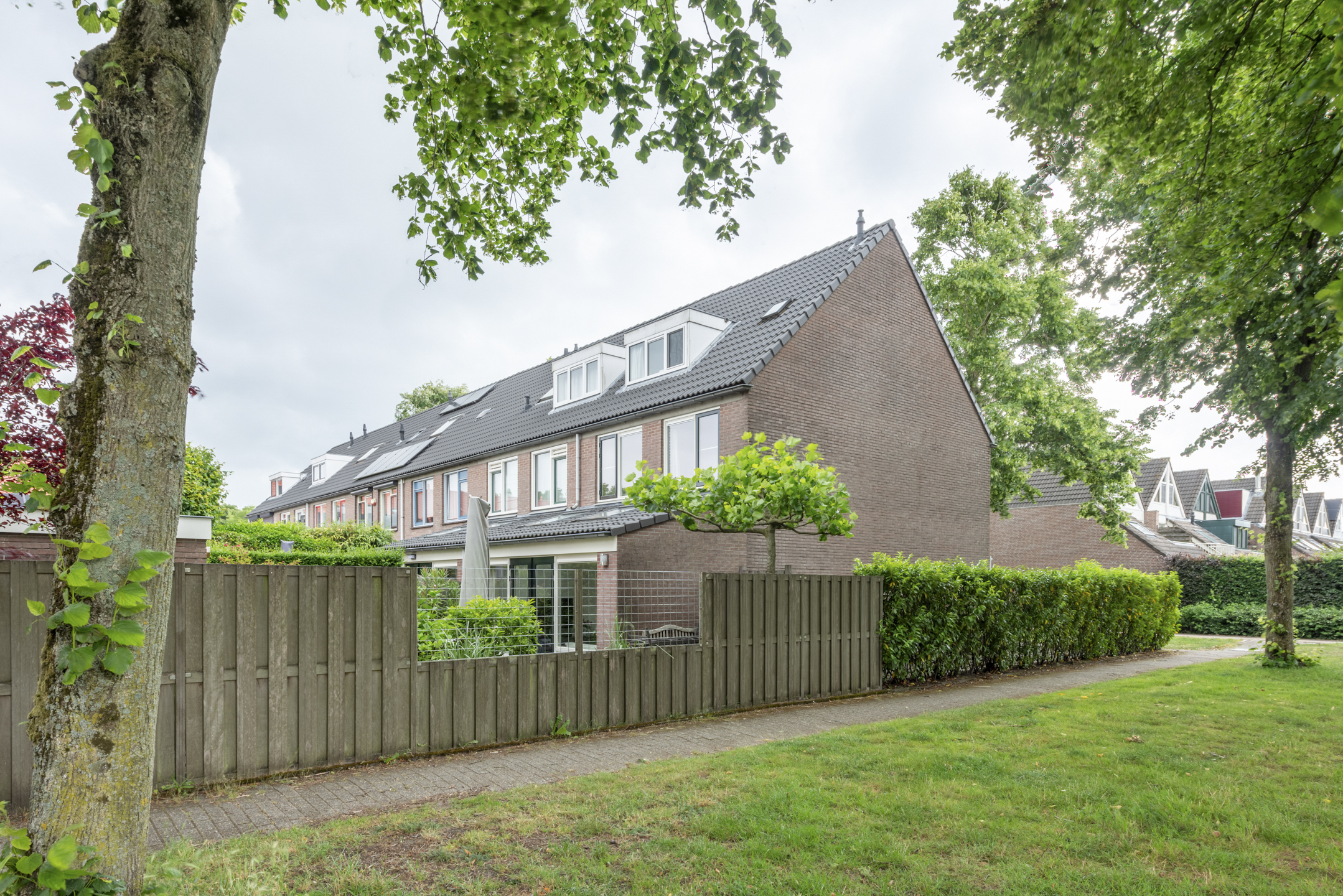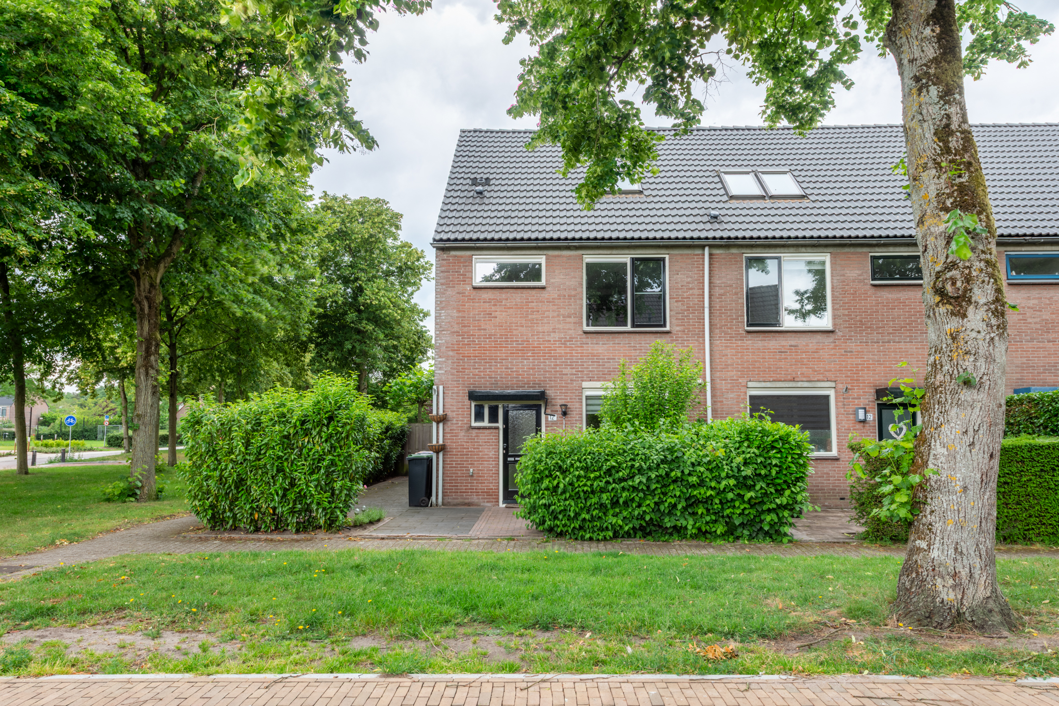 Dit huis ligt aan het einde van een rij woningen en wordt omgeven door een groot grasveld, zowel aan de voor- als de zijkant van het huis. Auto's worden geparkeerd op de naastgelegen parkeerplaats. Een heerlijk vrij uitzicht en alleen buren aan de rechterzijde.