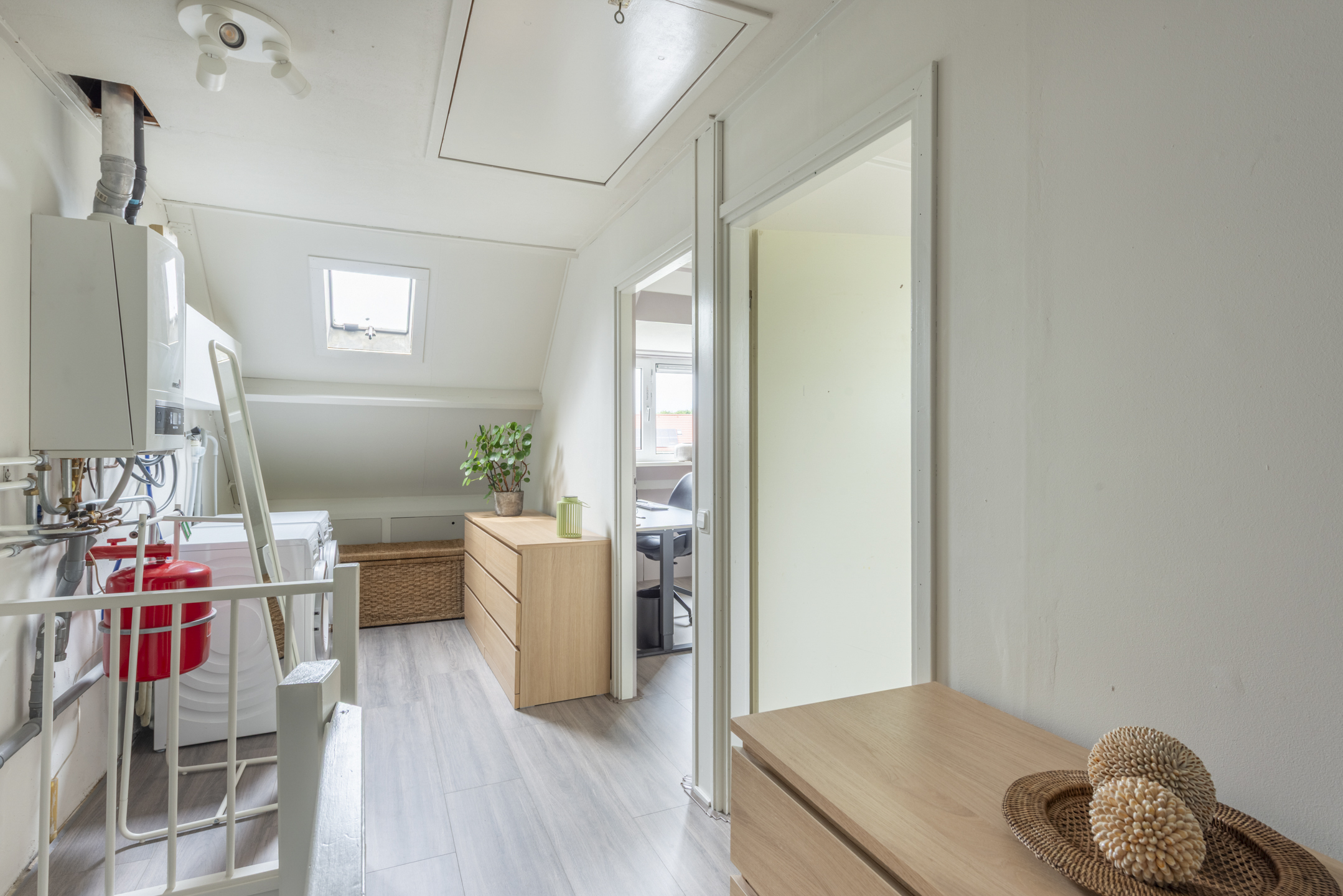 Voorzolder met ruimte voor wasmachine/droger en CV opstelling en een vlizotrap naar een verrassend grote bergvliering.