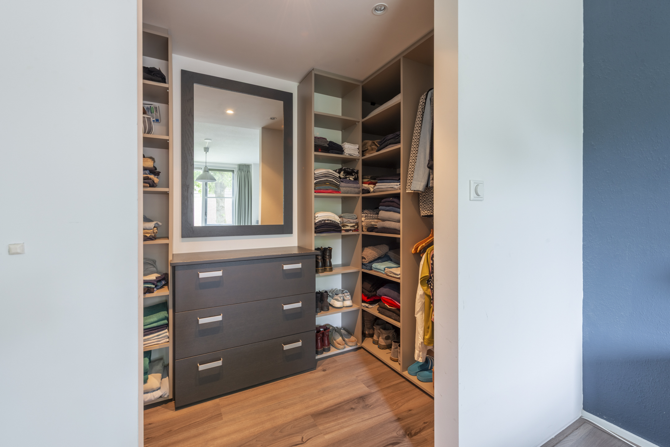Overloop, grote slaapkamer aan de achterzijde (voorheen 2 slaapkamers), masterbedroom aan de voorzijde met walk-in closet. De badkamer is ook in 2017 vernieuwd en heeft een inloopdouche, wastafel en toilet.