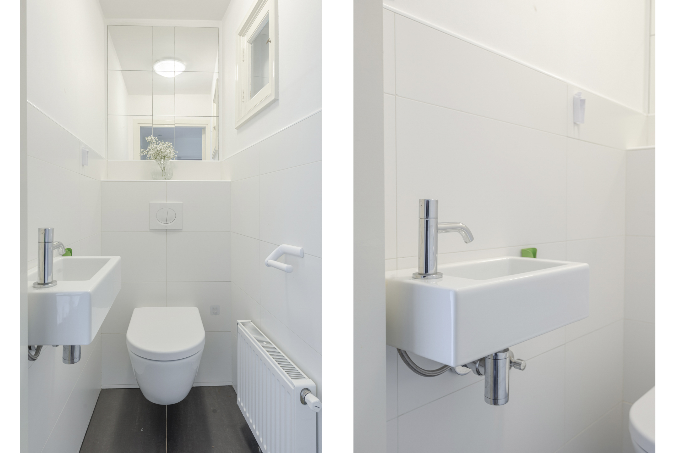 entree, hal, toilet met fonteintje, toegang naar de kelder van 11m2 groot, eetkamer met moderne keuken voorzien van inbouwapparatuur en composiet aanrechtblad, vanuit de keuken toegang naar de ruime bijkeuken.
