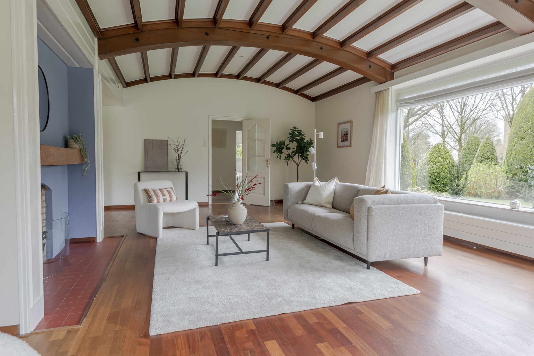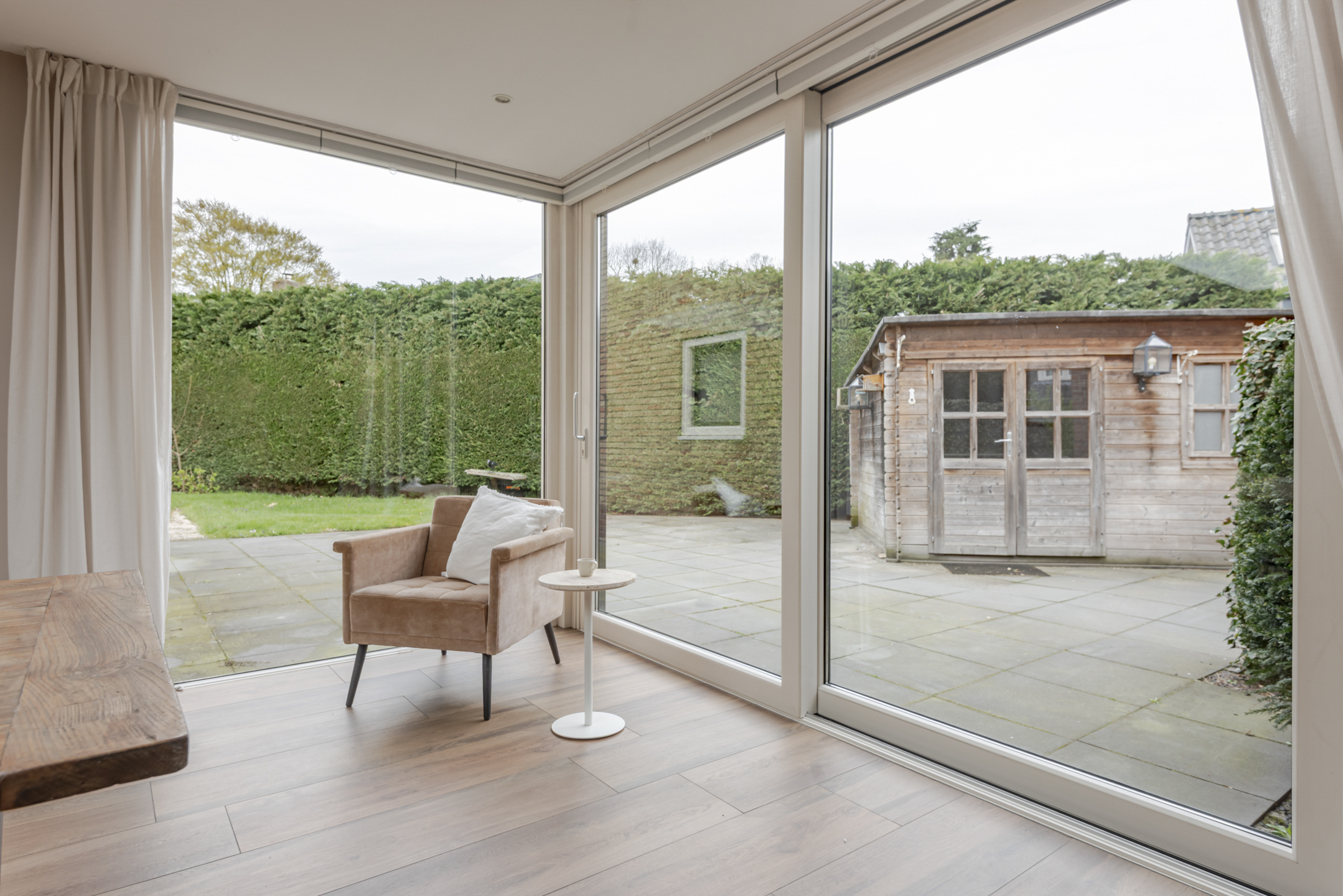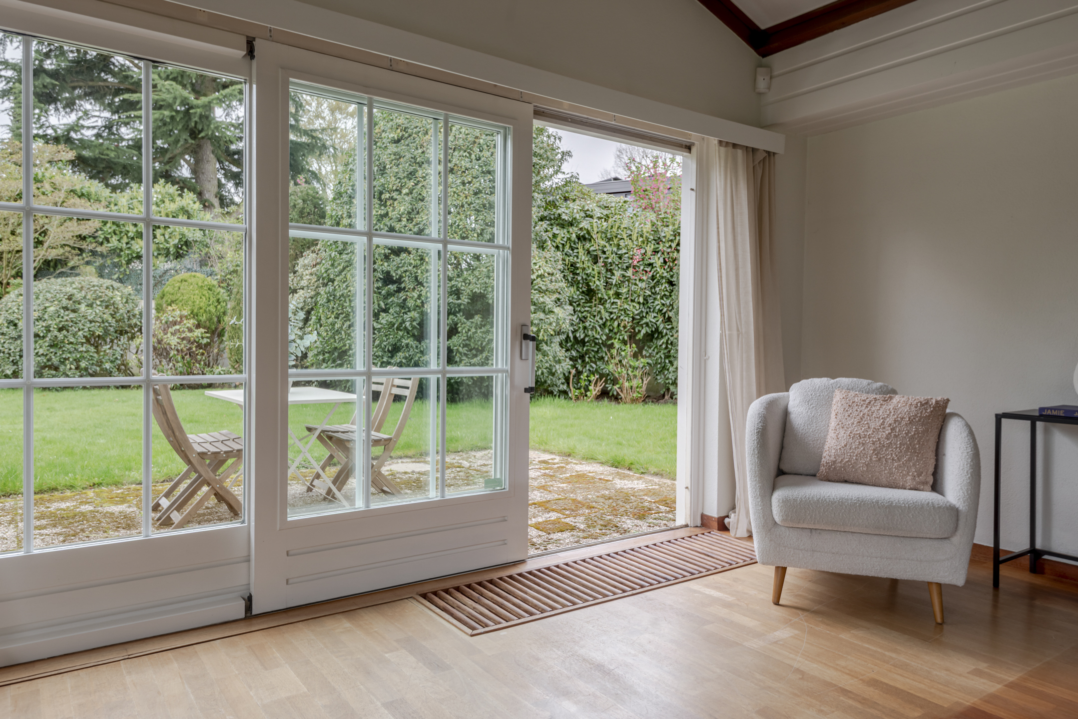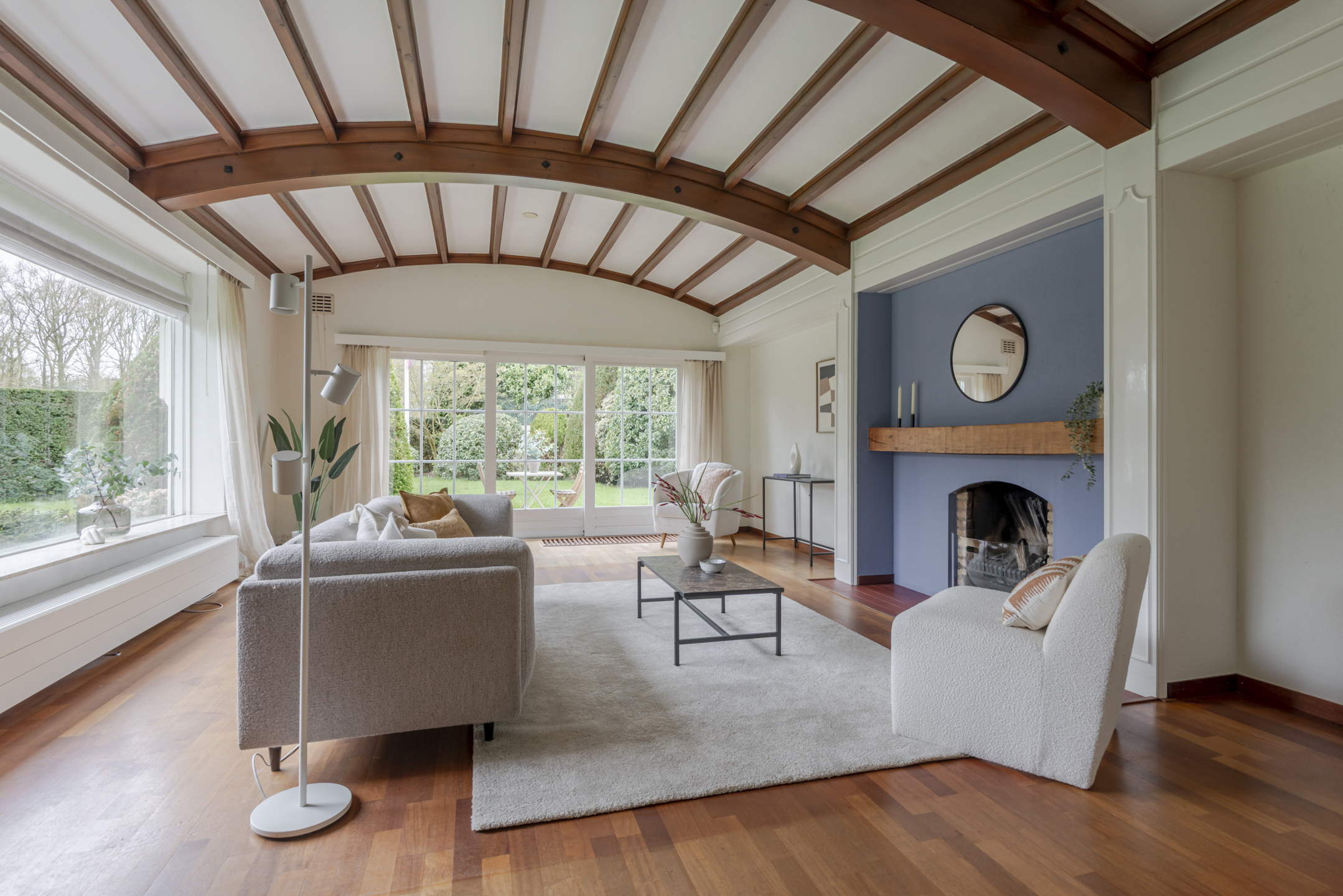 - Ruime lichte woonkamer met open haard, grote raampartijen en schuifpui naar de tuin.