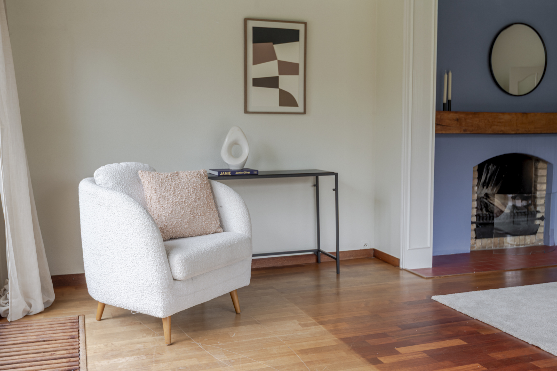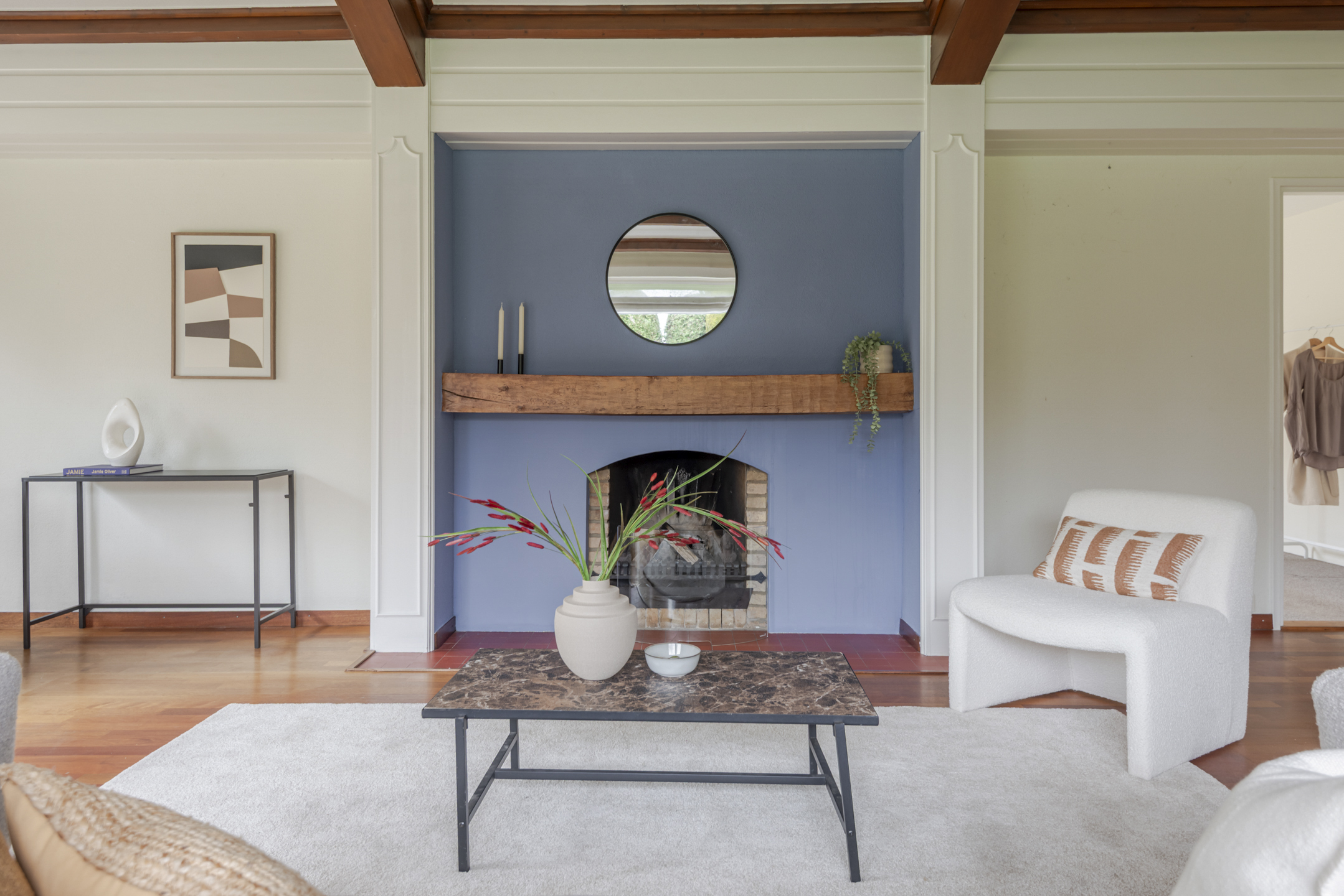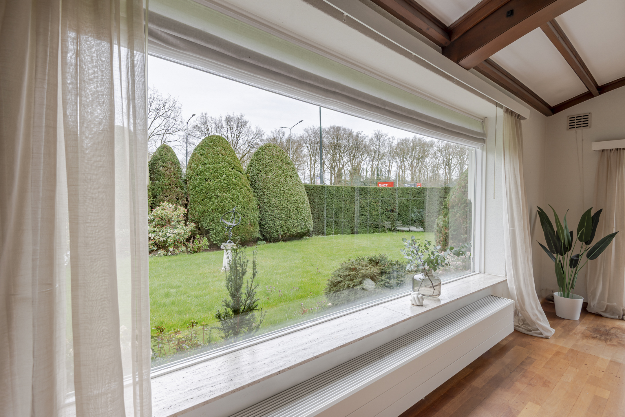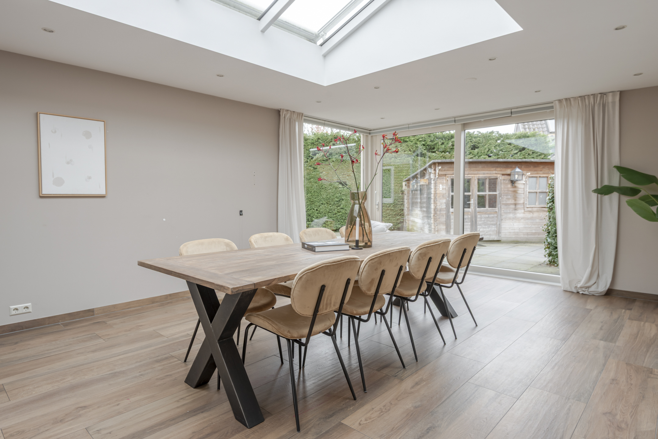 - Ruime lichte woonkamer met open haard, grote raampartijen en schuifpui naar de tuin.