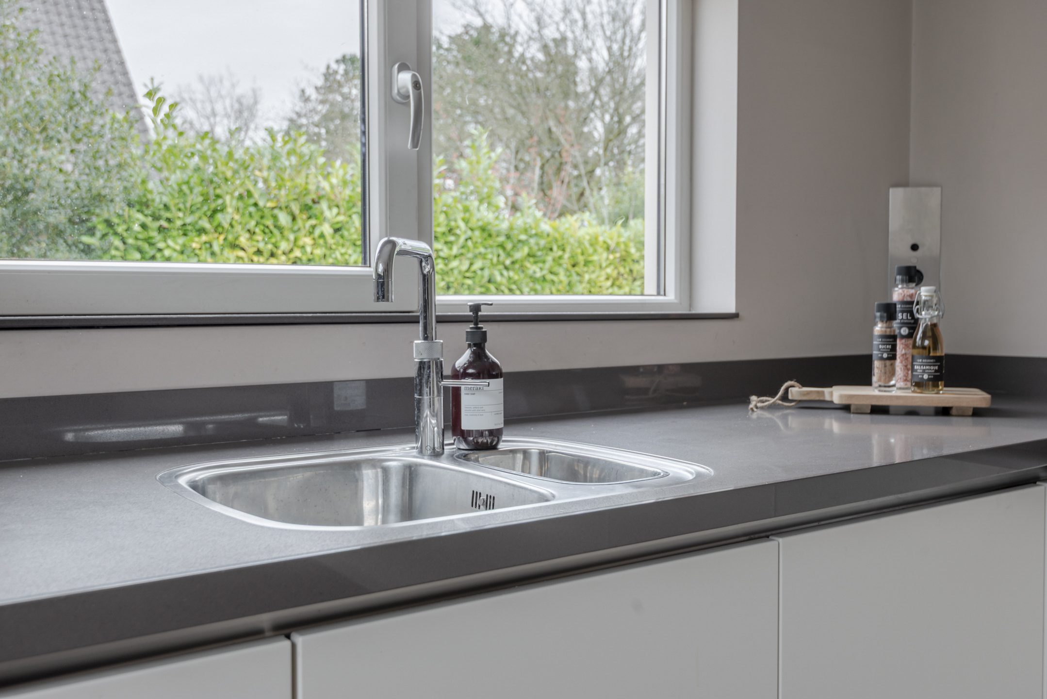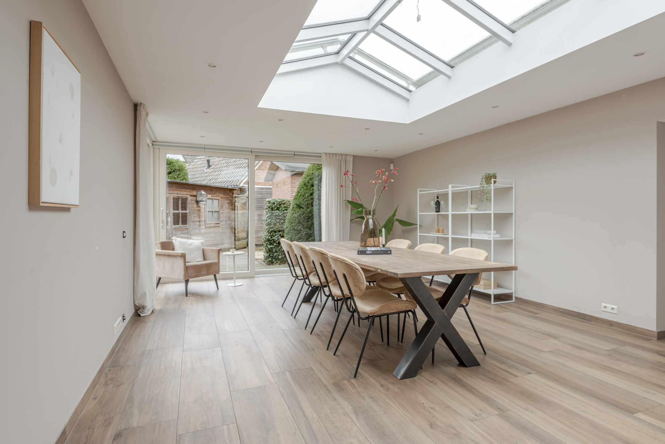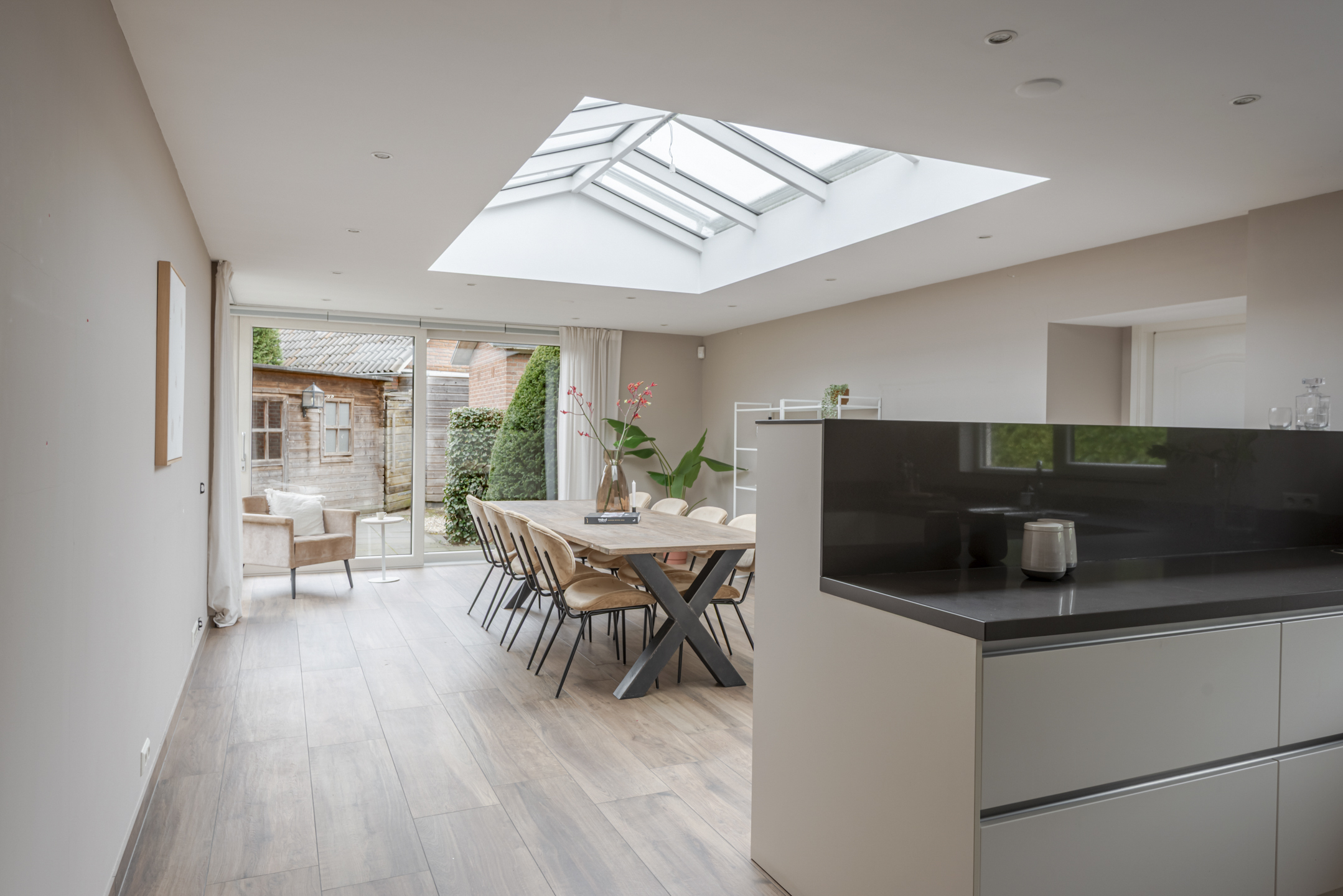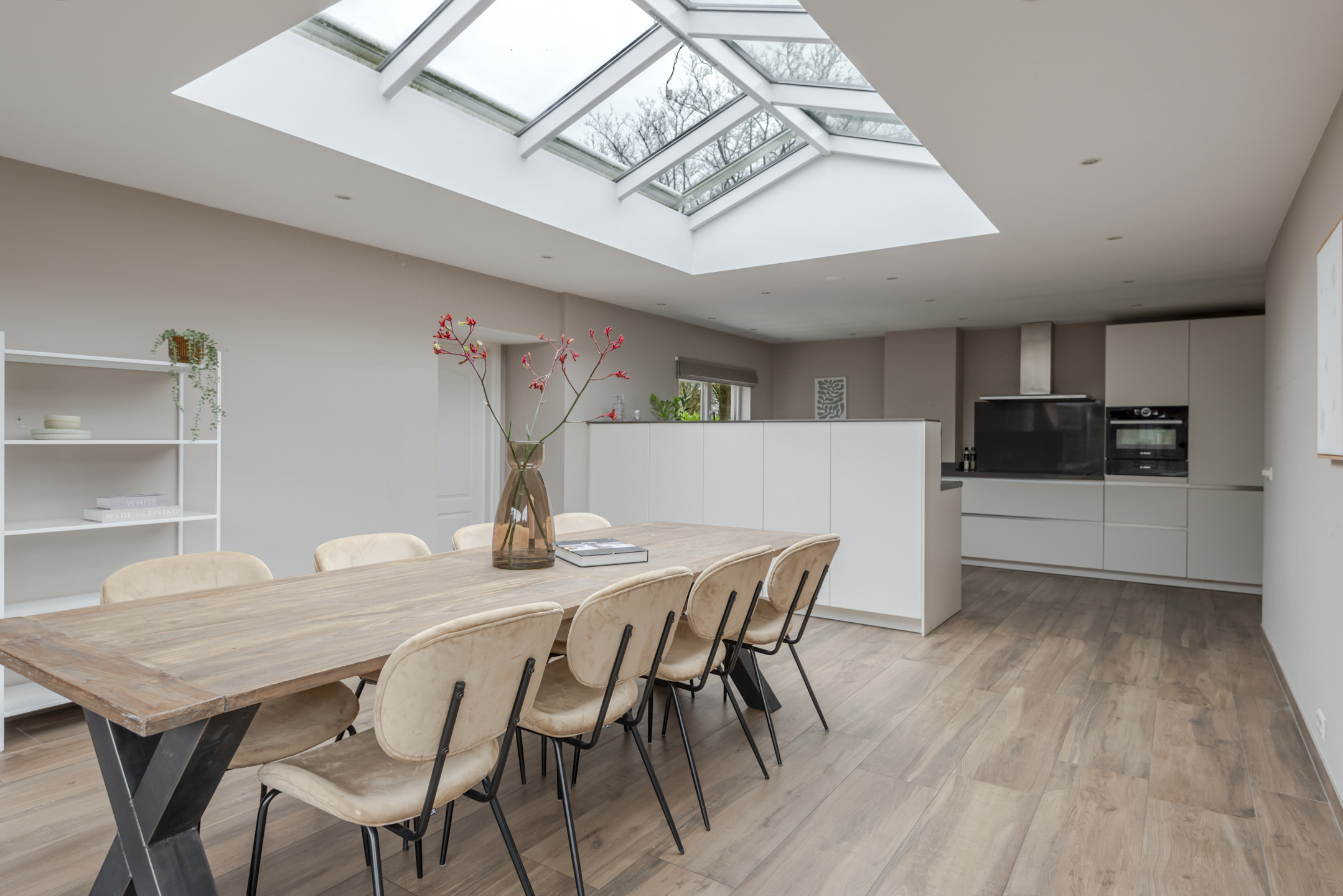 - In 2015 aangebouwde leefkeuken met dakraam en schuifpui naar het terras; een heerlijke grote lichte keuken.