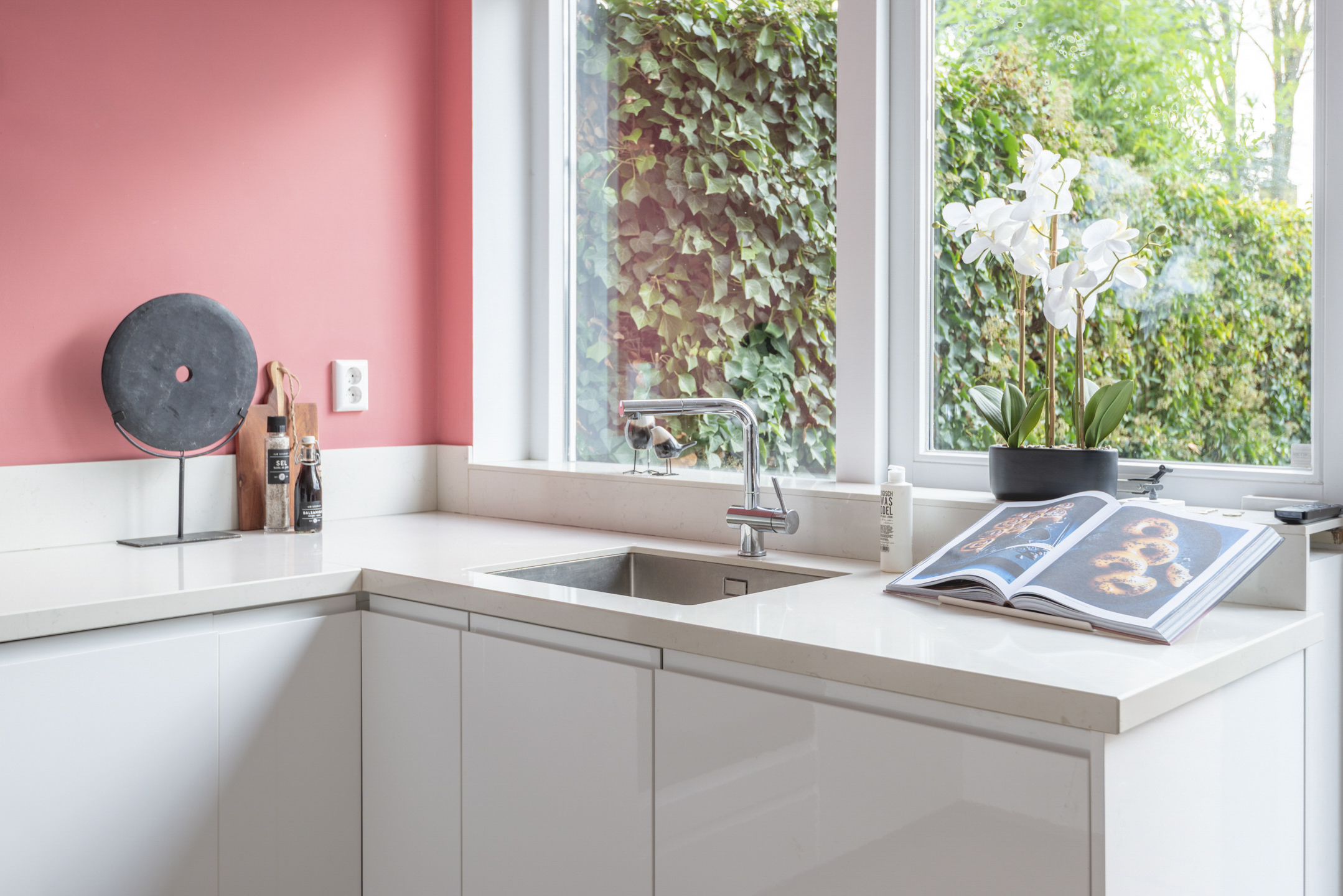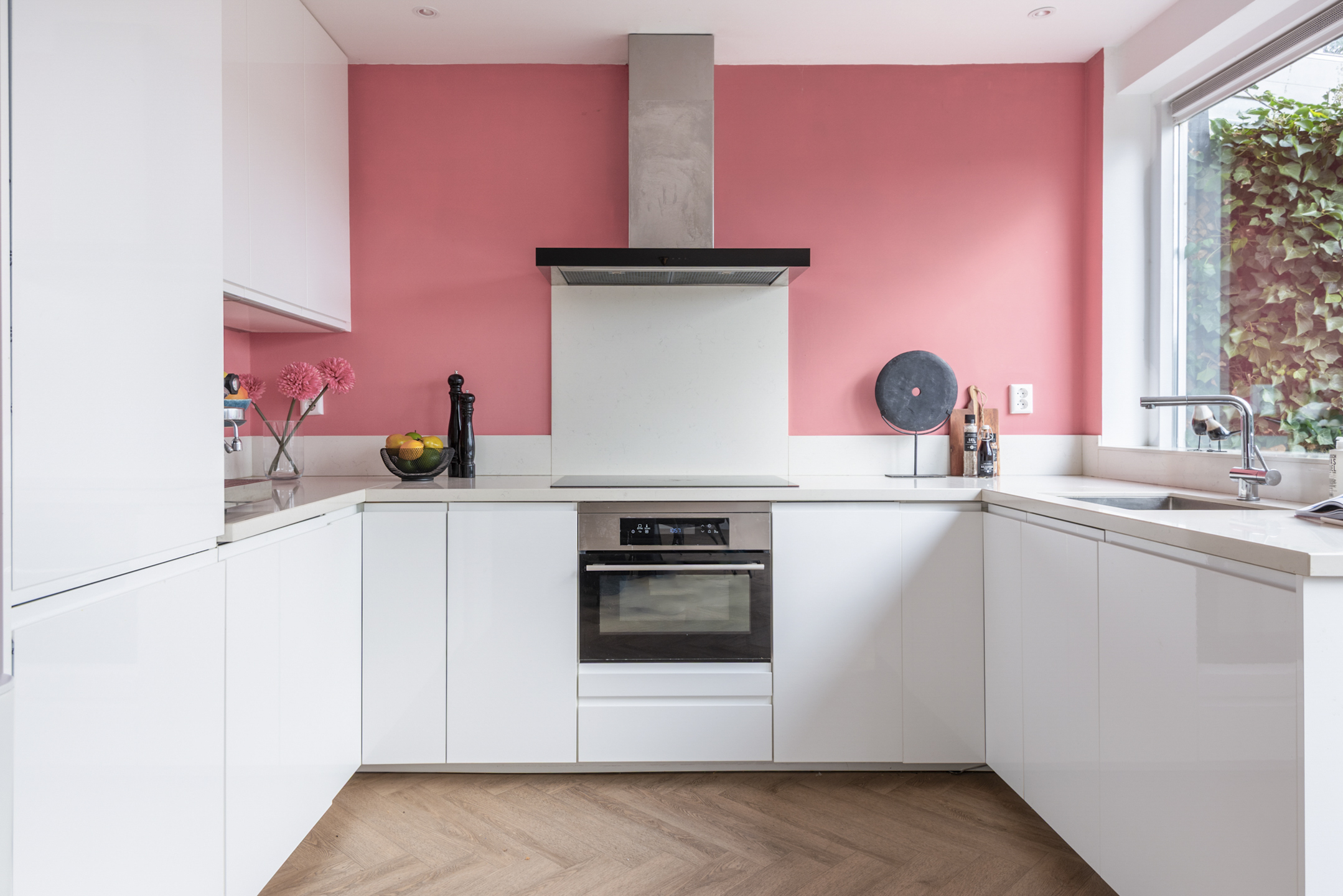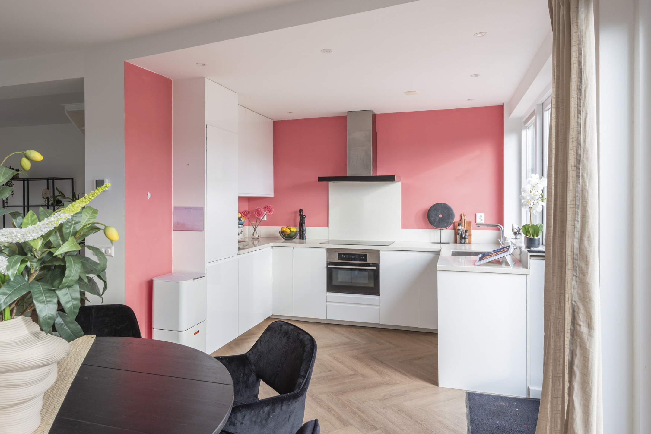 - Moderne keuken met ingebouwde inductiekookplaat, combi-oven, vaatwasser, koelkast en vriezer.