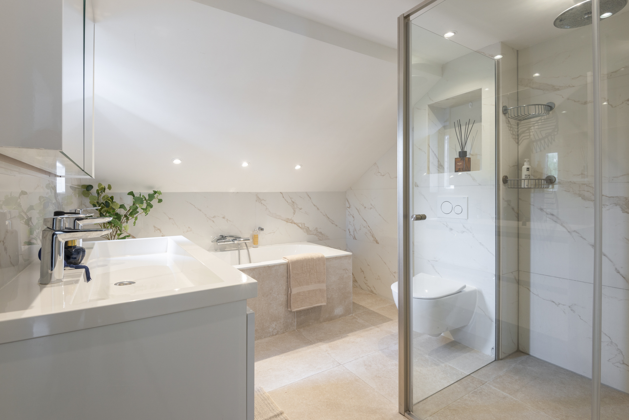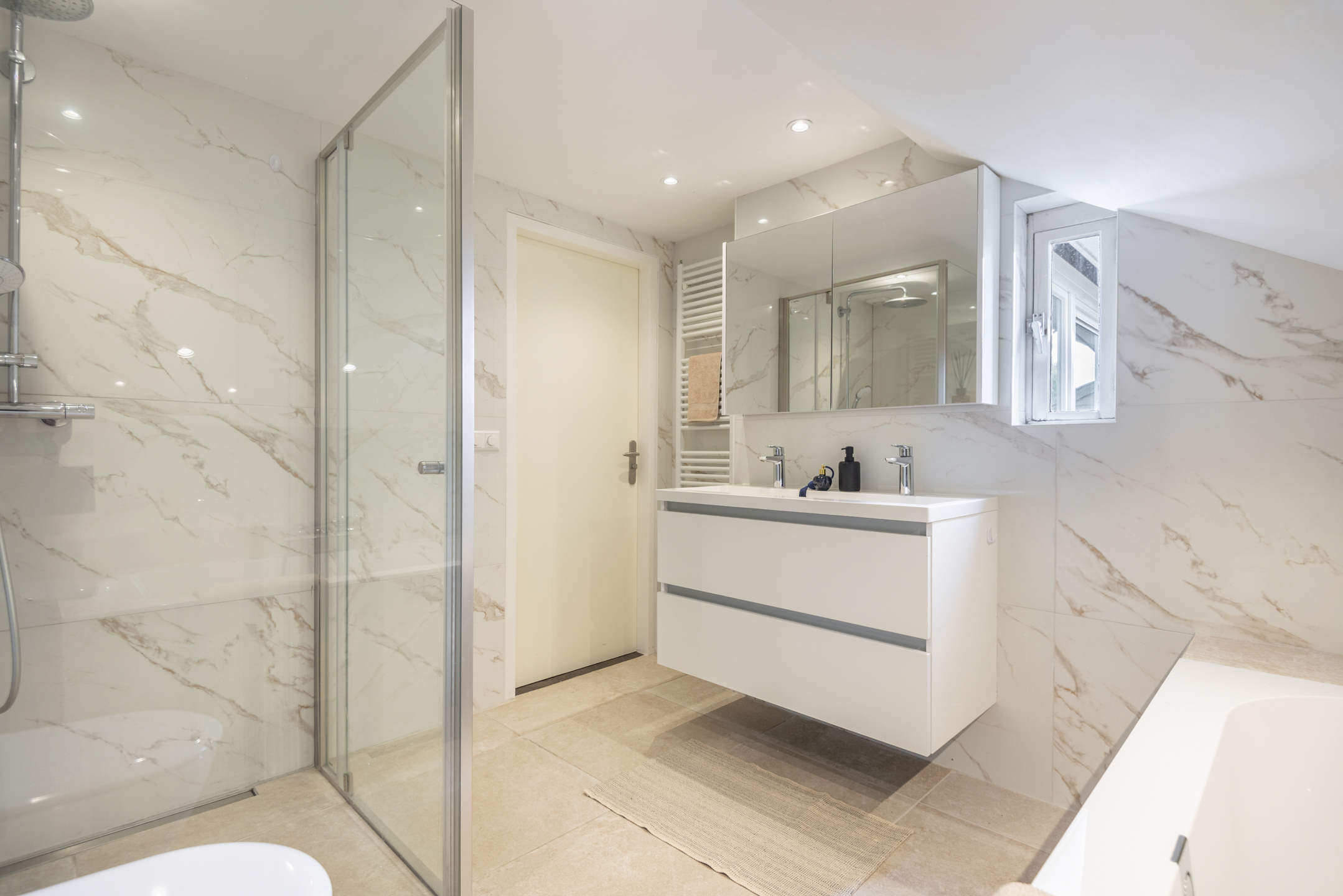 - Grote en luxe badkamer met ligbad, grote inloopdouche, dubbele wastafel en toilet.