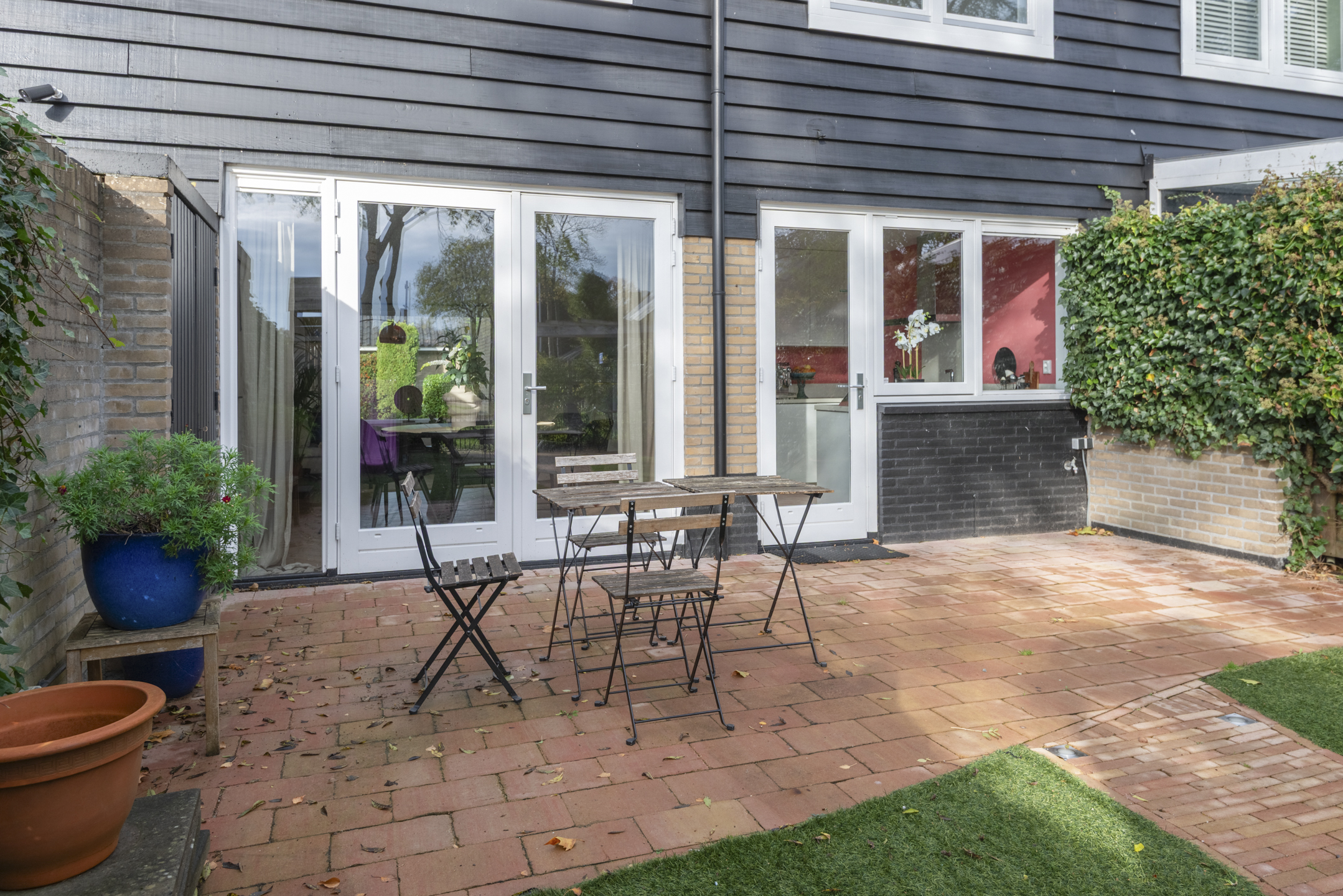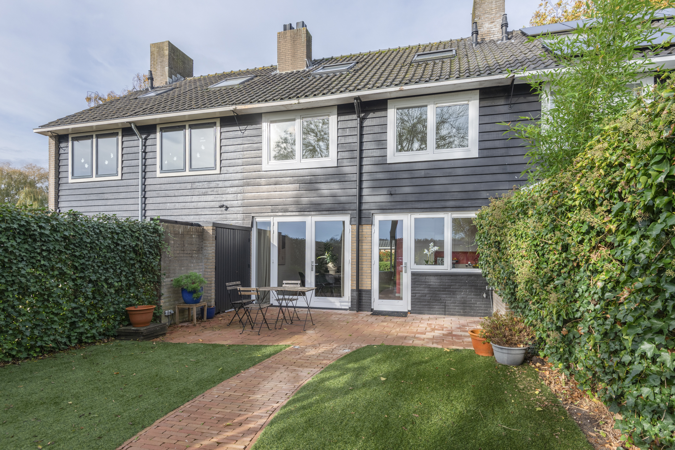 - De achtertuin grenst aan een grasveld en wandelpad.