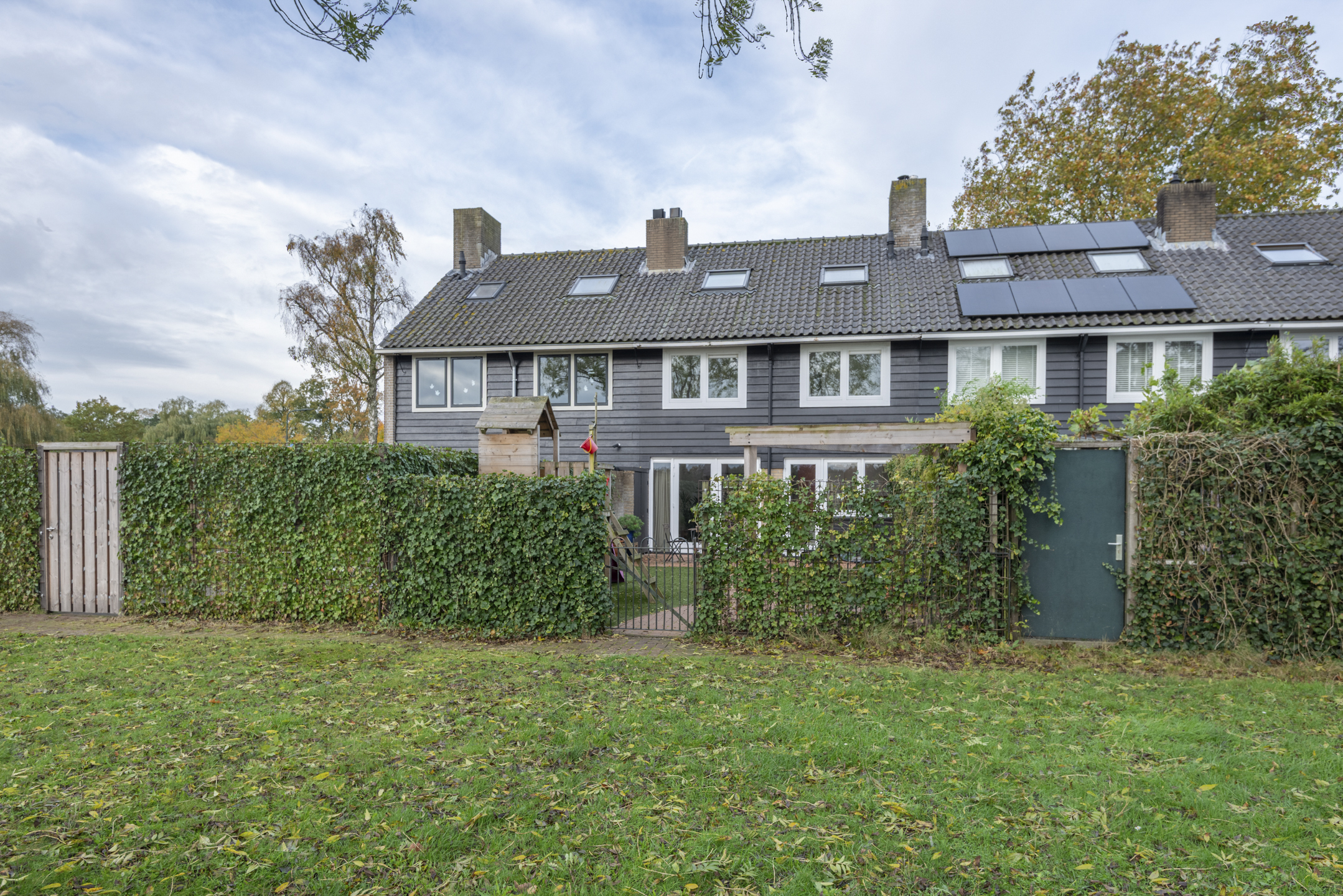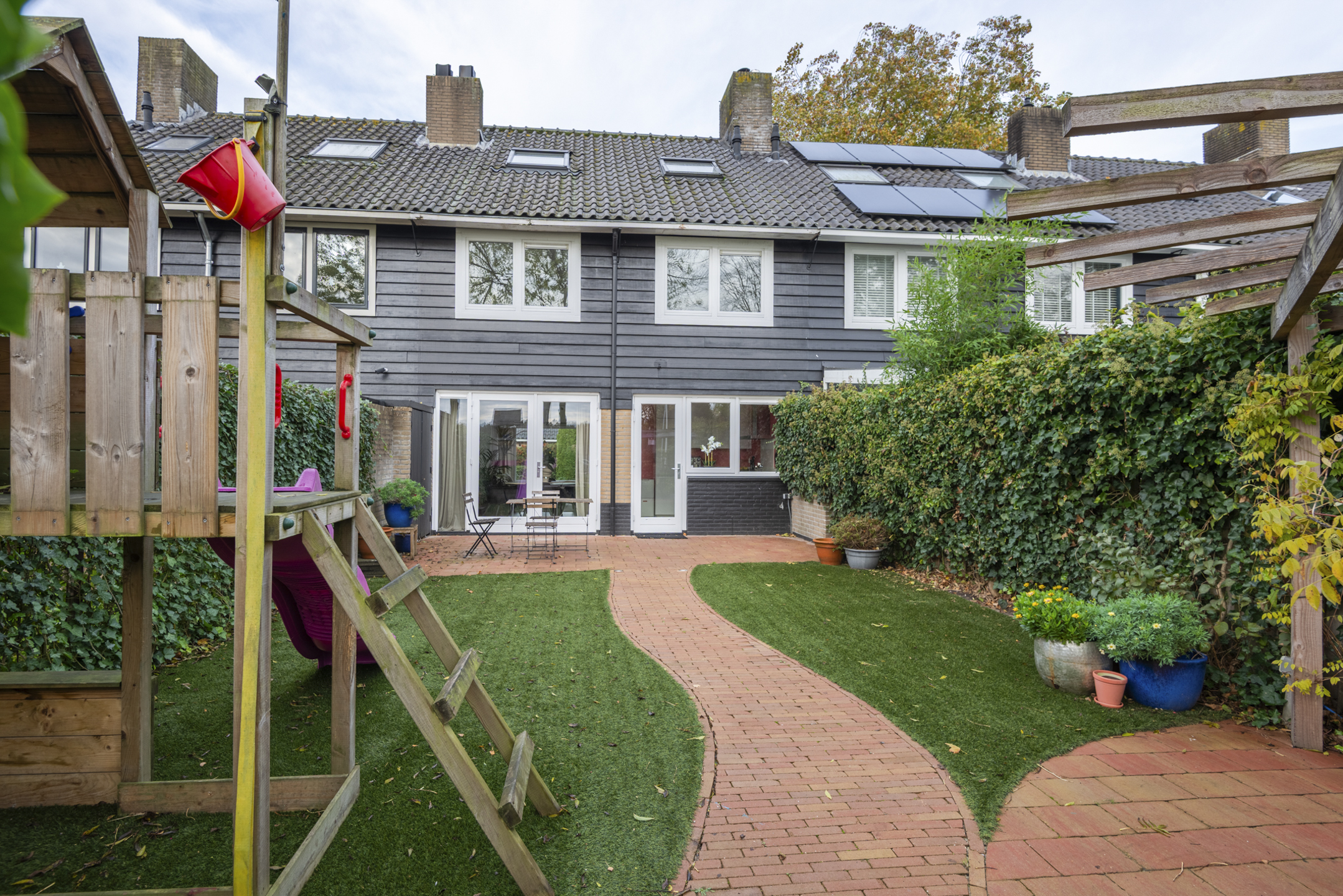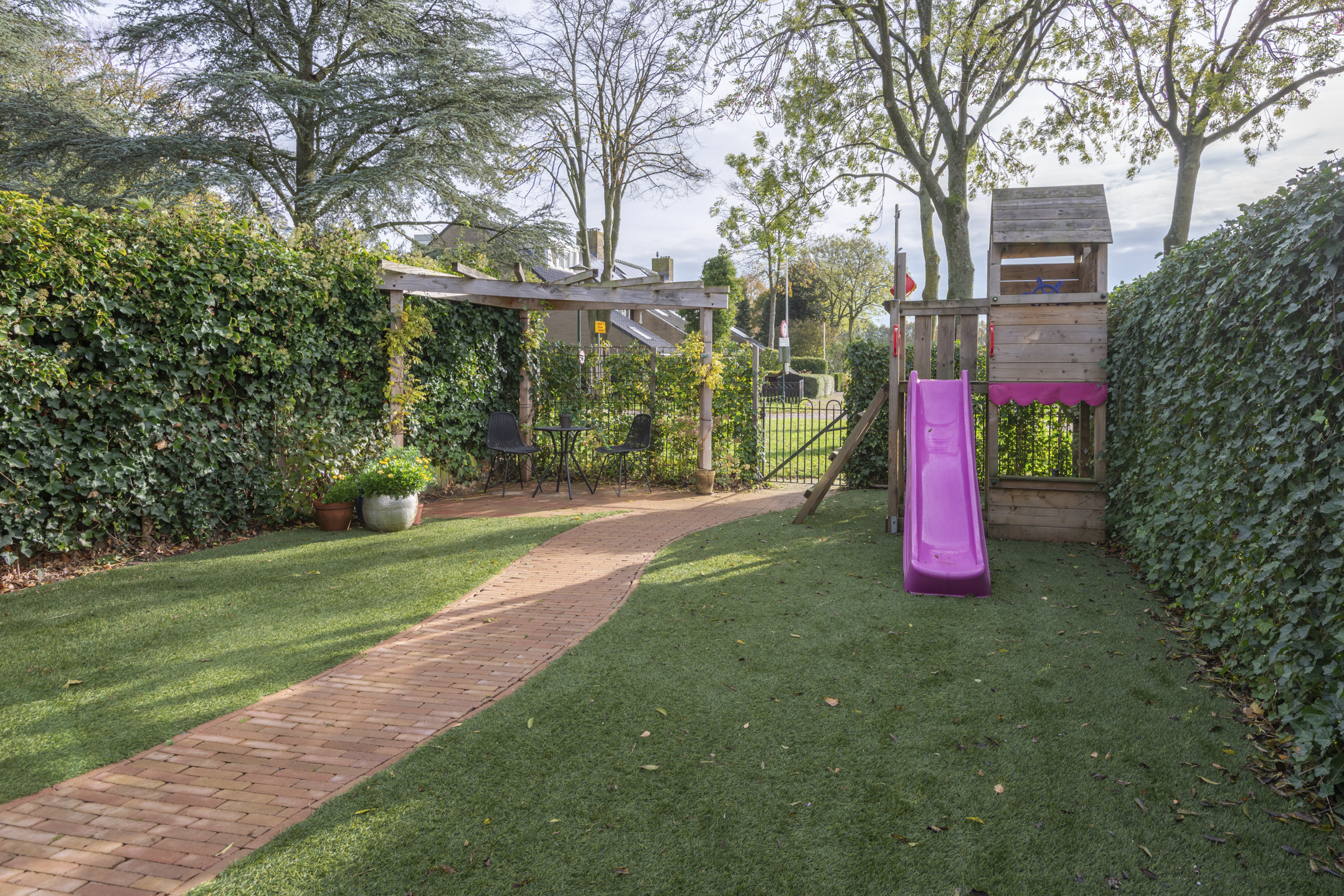 - Achtertuin op het zuidoosten met speelhuisje en poort naar speelveldje en daarachter gelegen wandelpad.