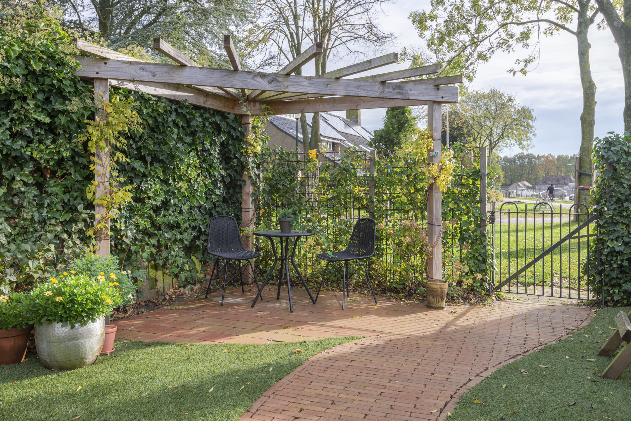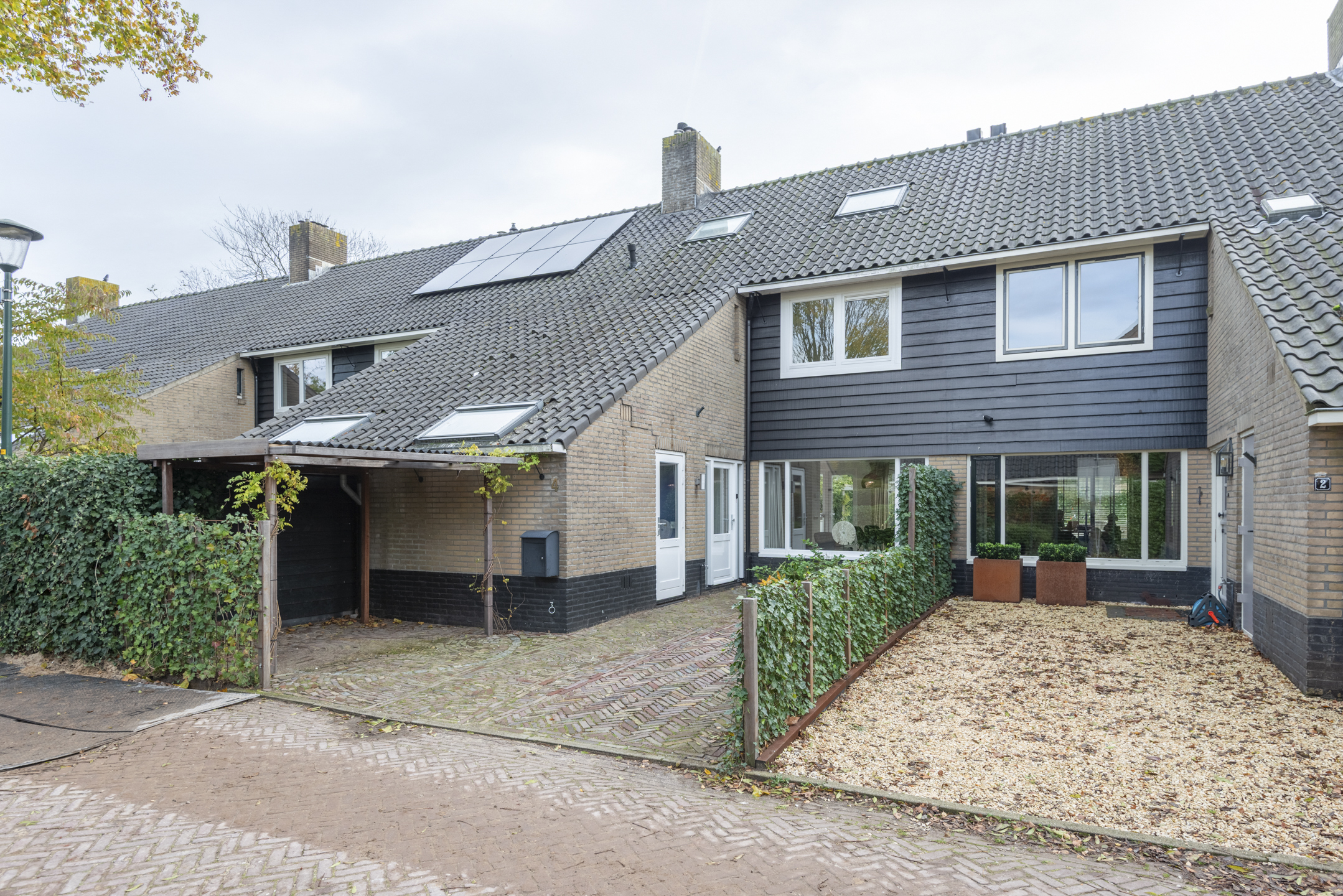 - Voortuin met (fiets)overkapping.
