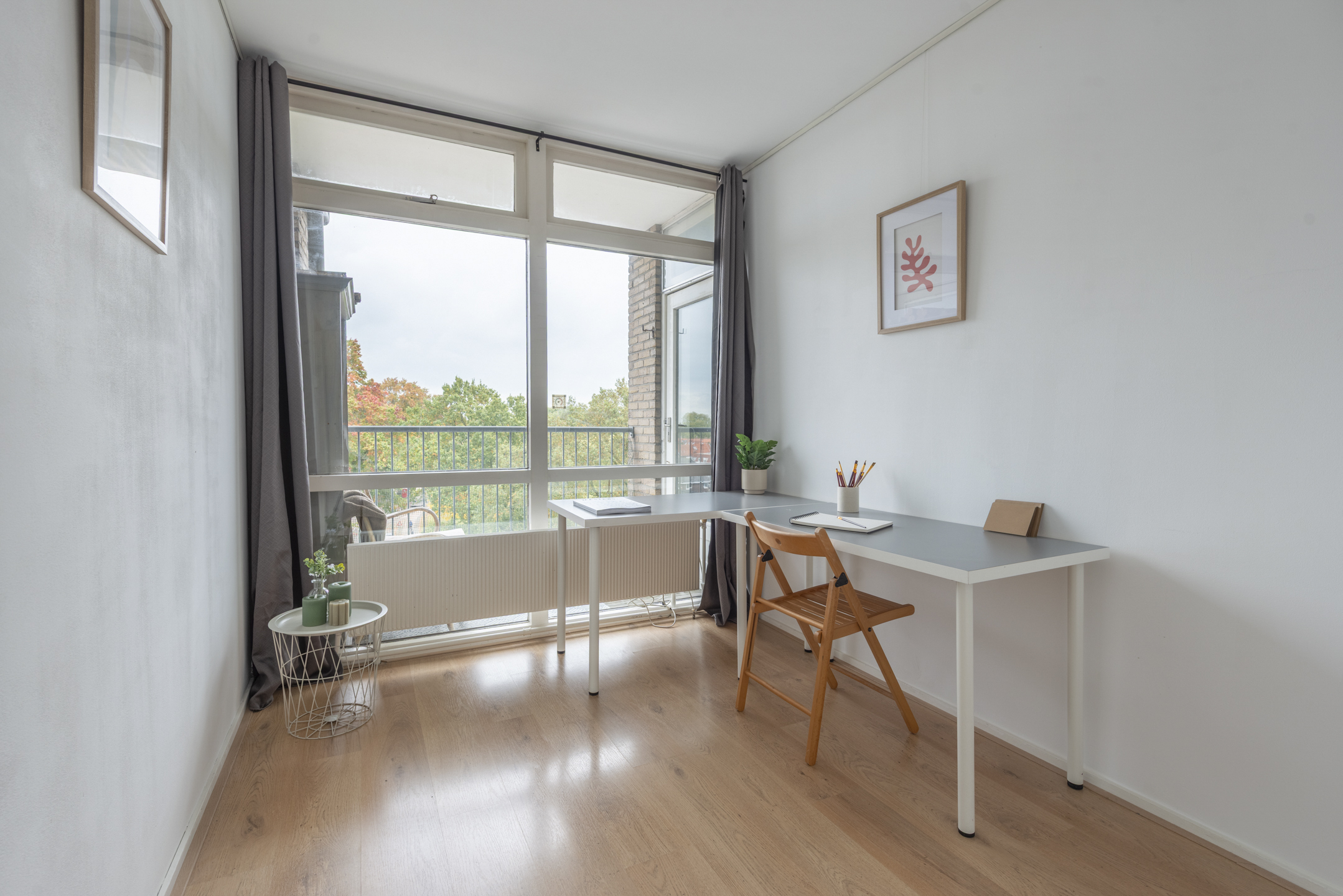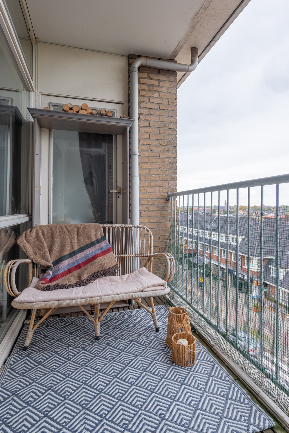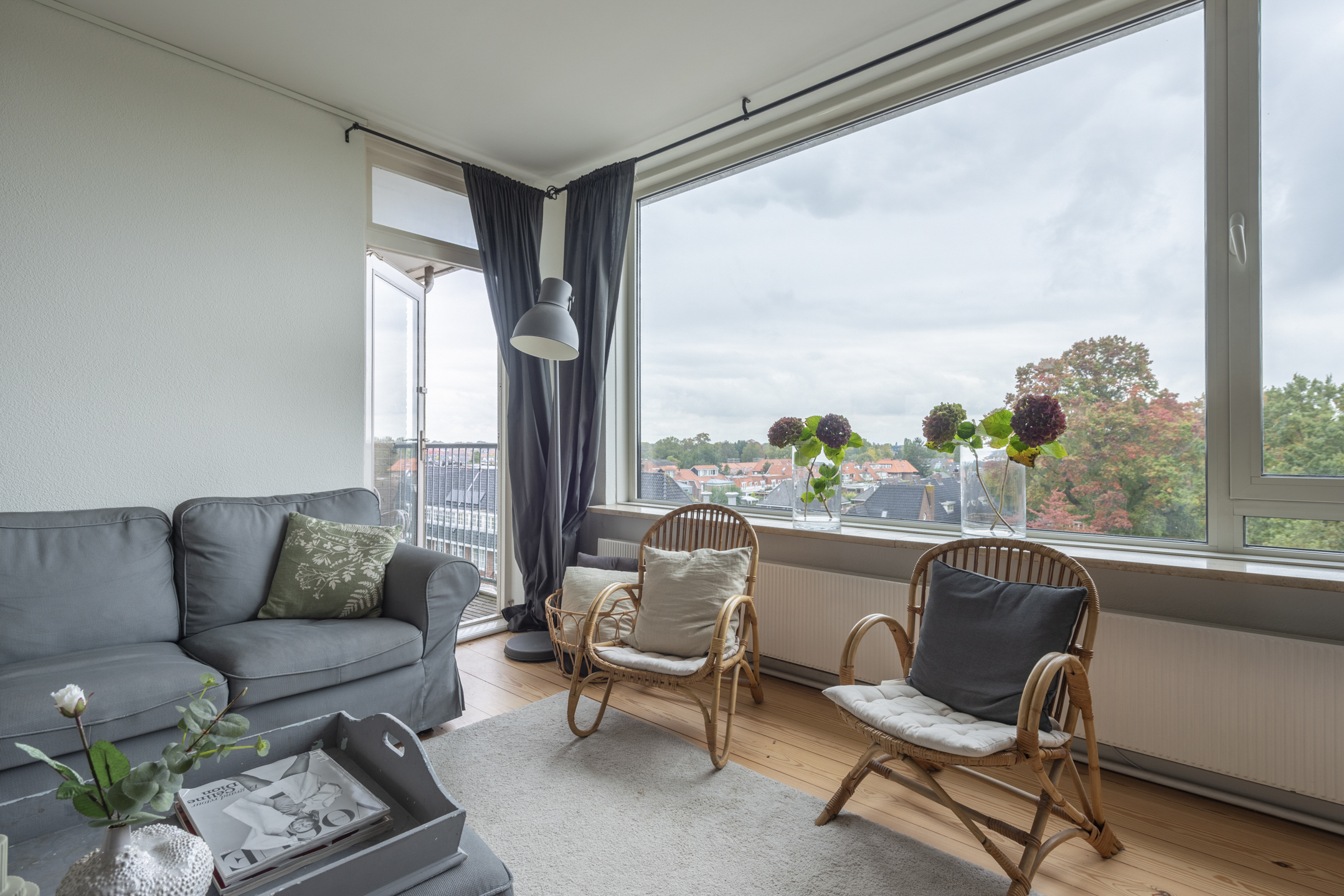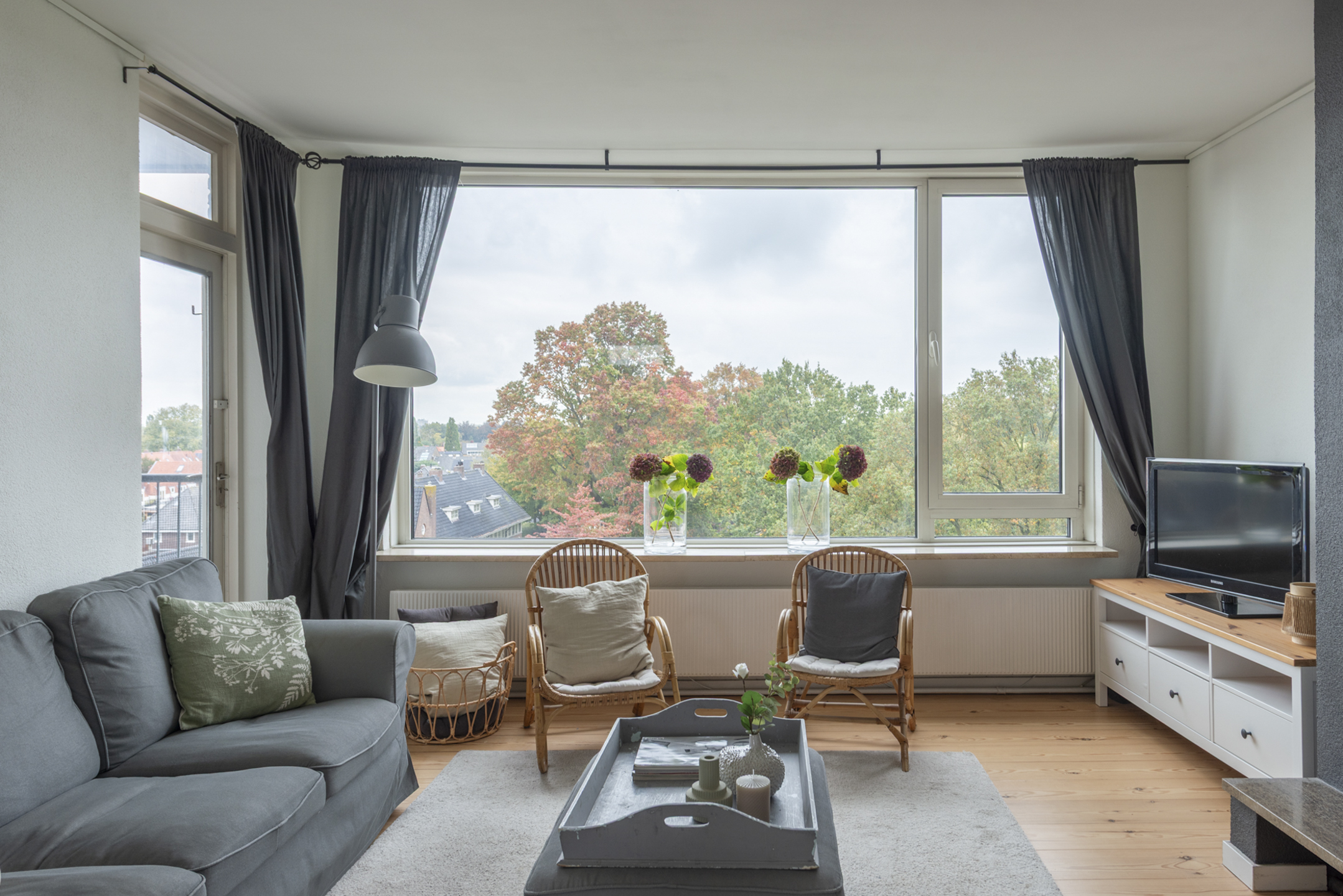 Dit ruime appartement ligt op het einde van de galerij op de vierde verdieping. Daardoor is het een heel lichte en ook een heel rustige plek. Vanuit de woonkamer en balkon kijk je uit over het groen van het Mouwtje en de boomtoppen van Bussum en Naarden, terwijl onder je de reuring van het centrum aan je voorbij trekt. Op de galerij kun je rustig op een bankje van de zon genieten.