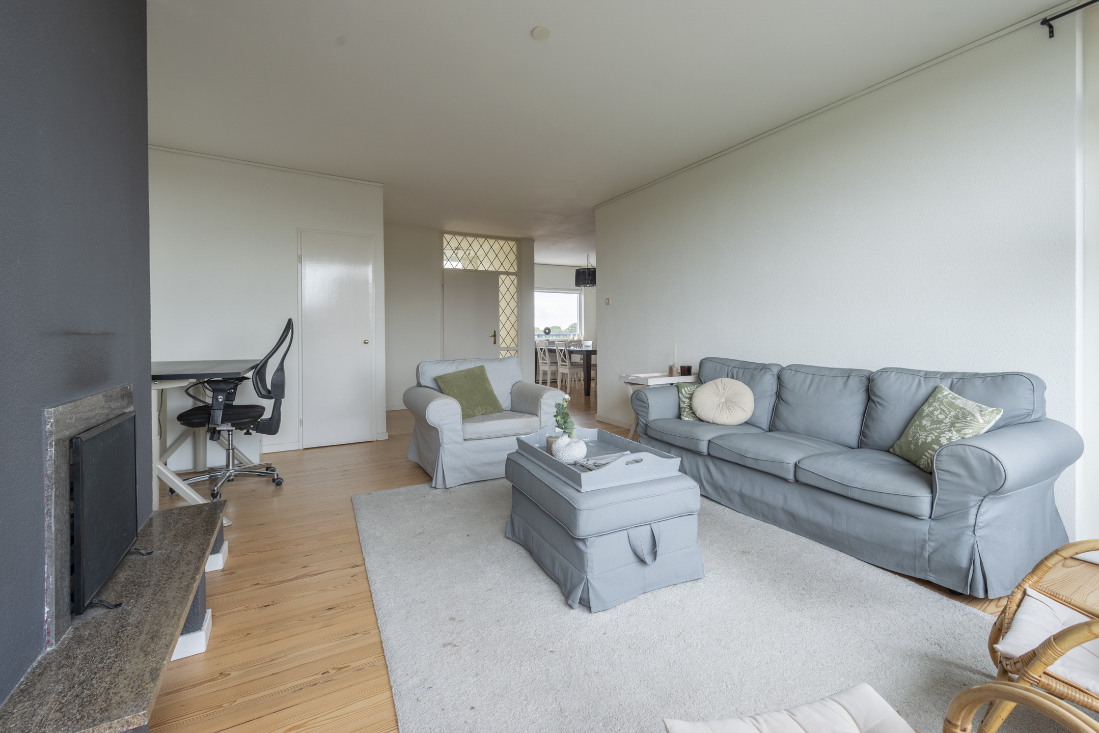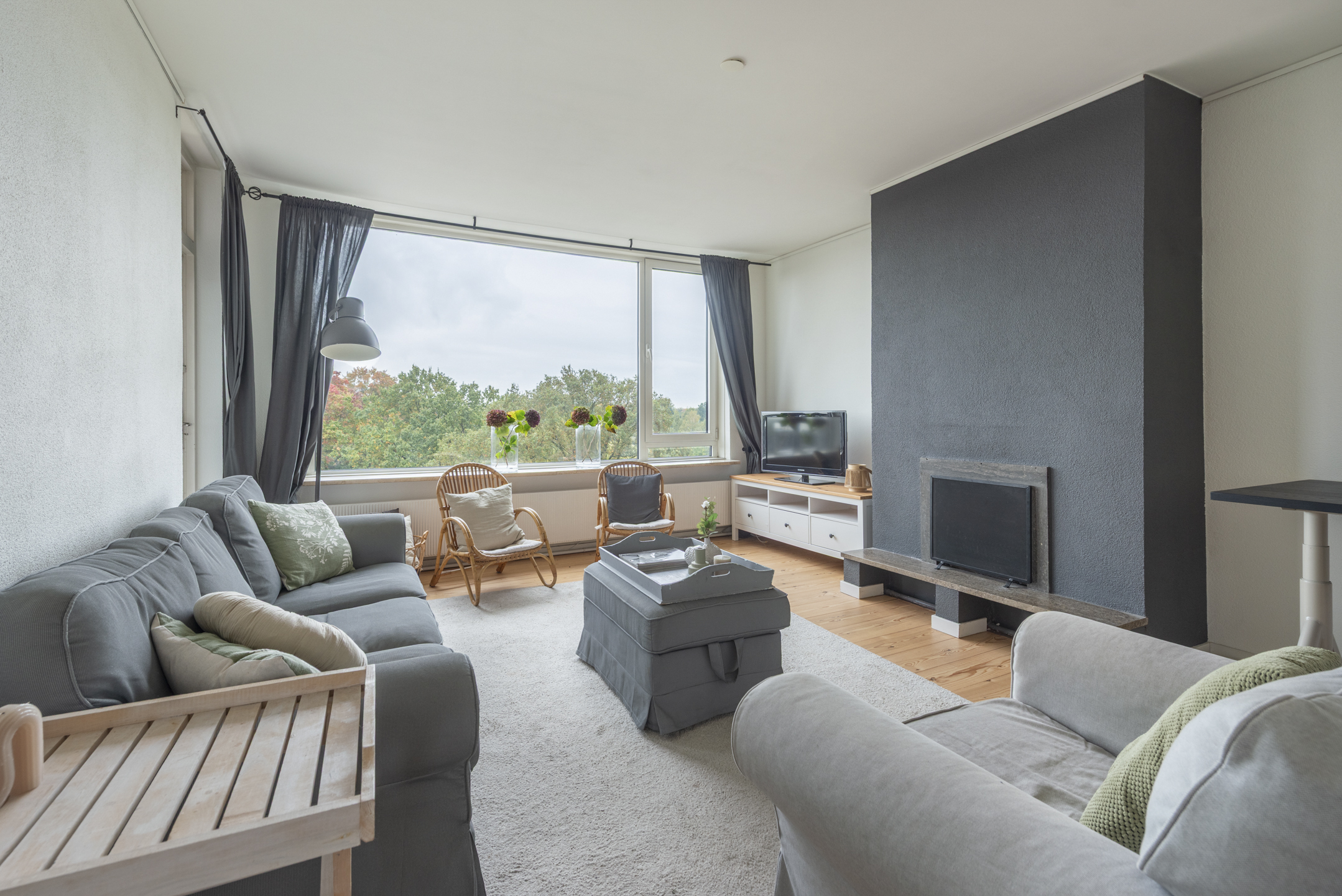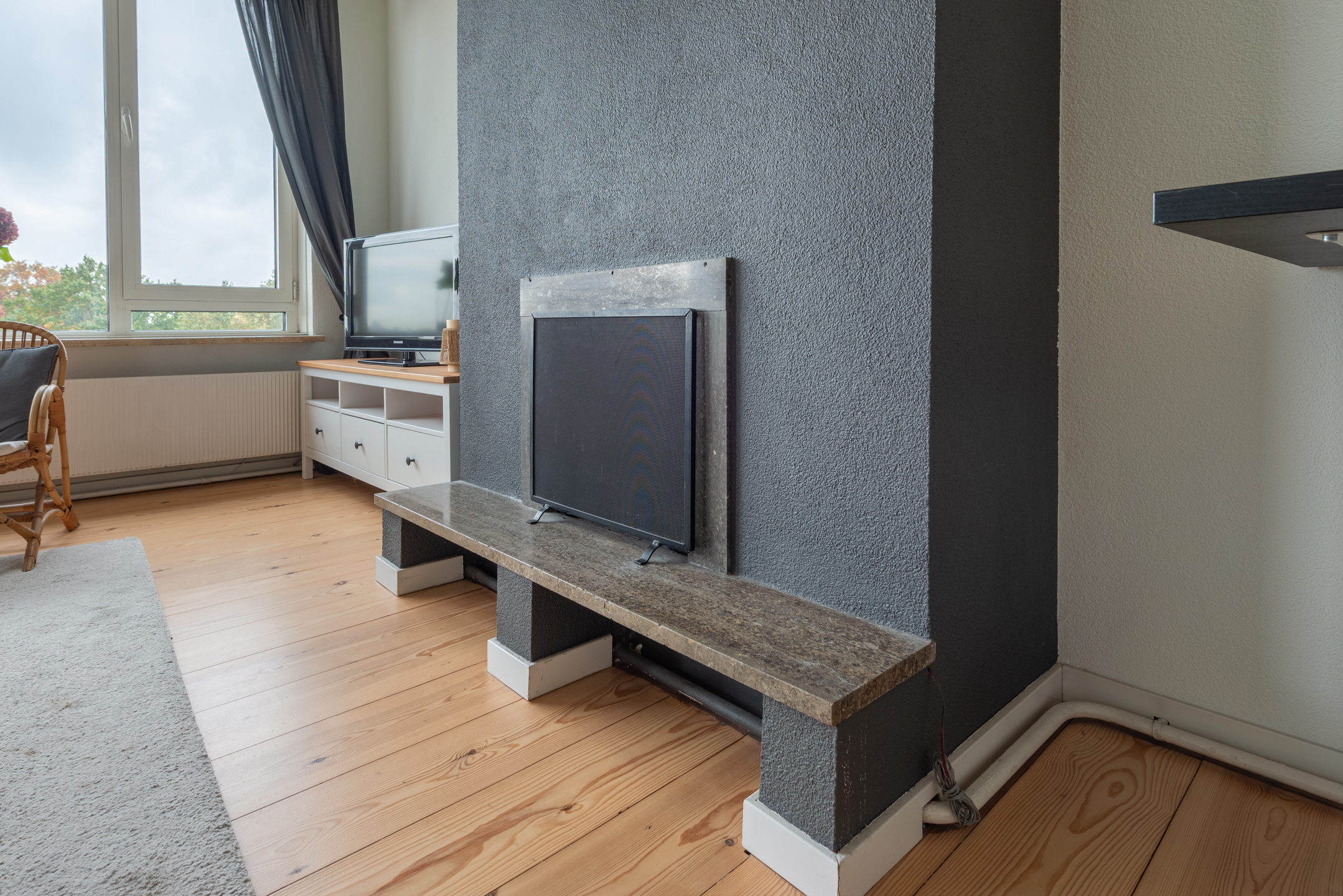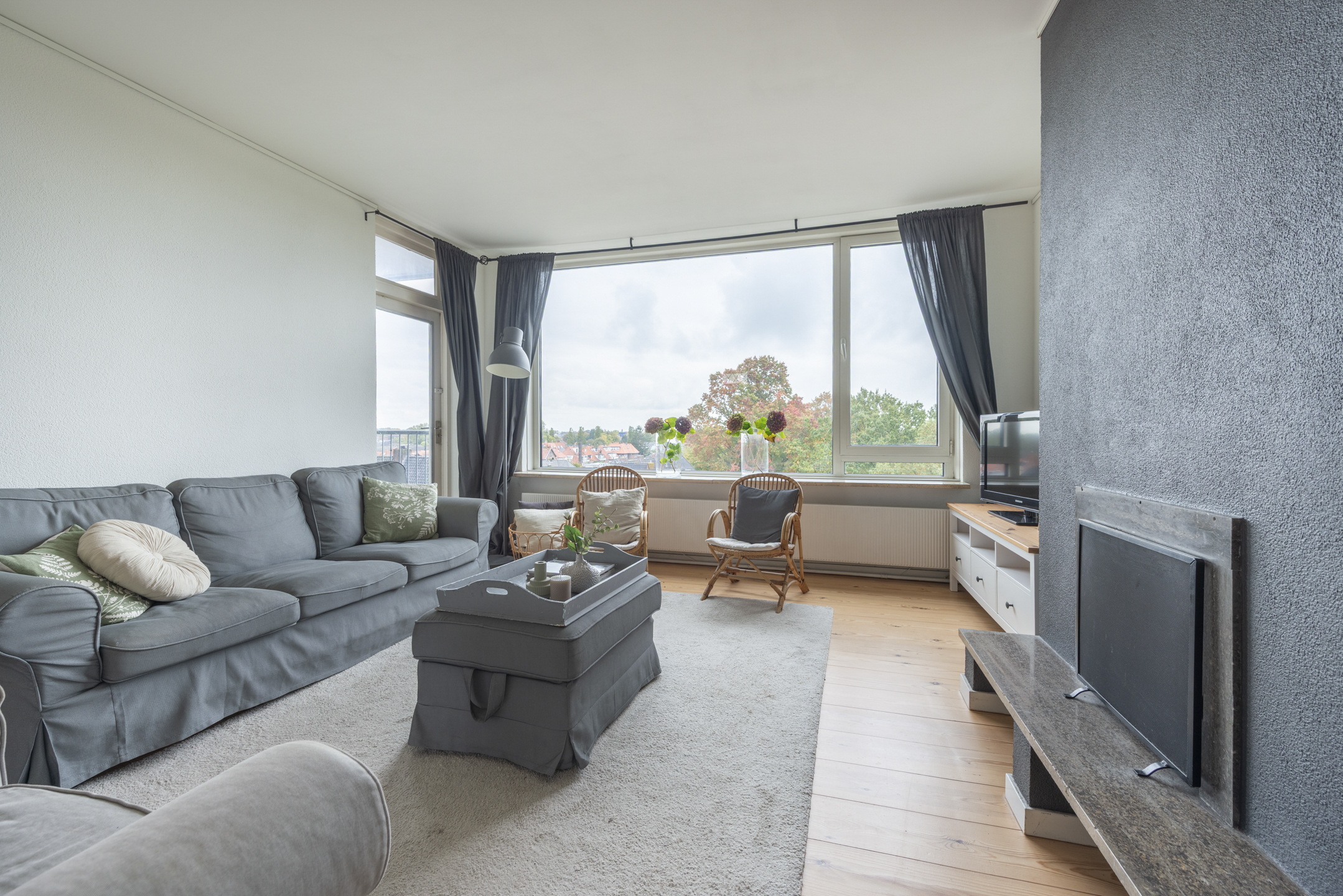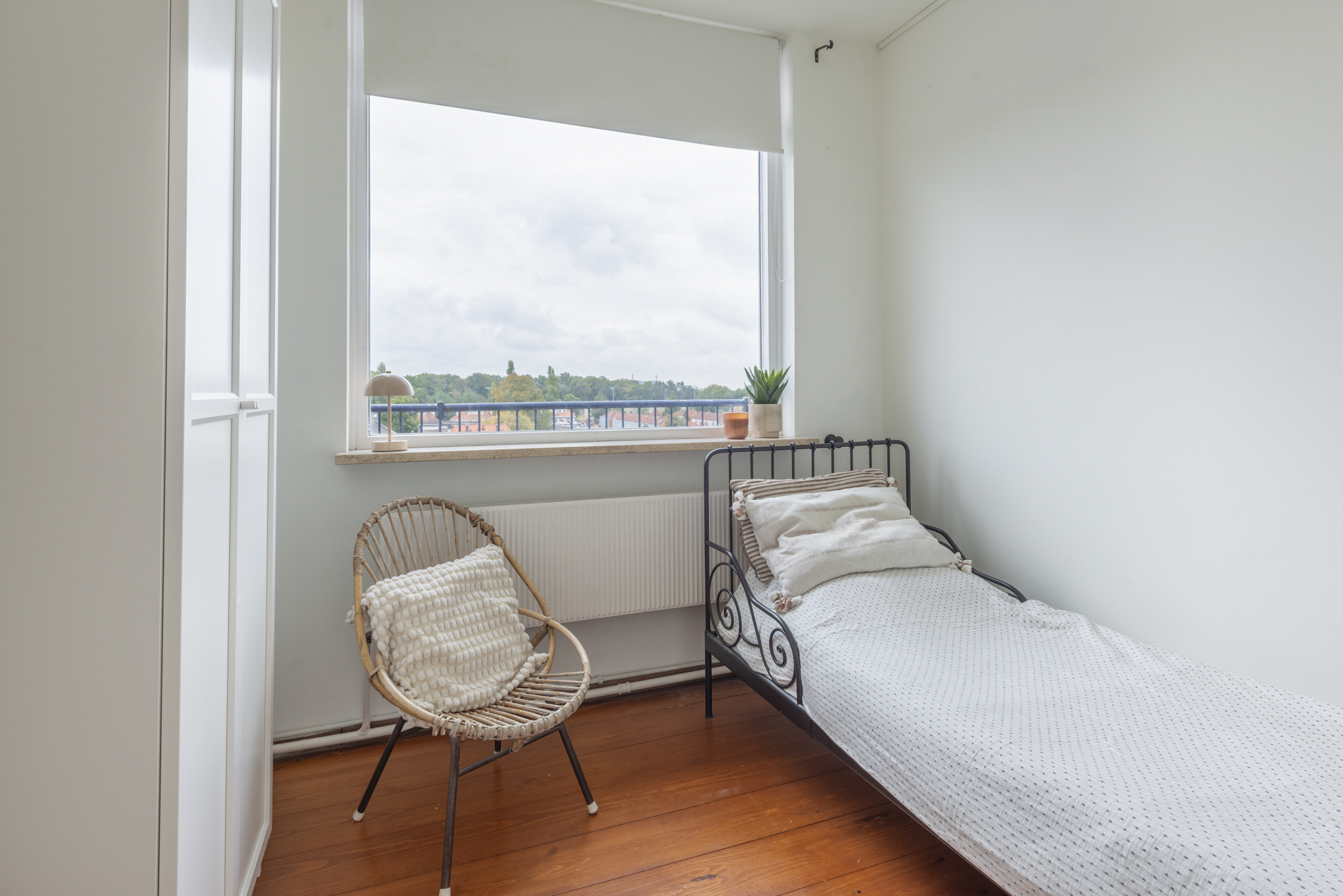Dit ruime appartement ligt op het einde van de galerij op de vierde verdieping. Daardoor is het een heel lichte en ook een heel rustige plek. Vanuit de woonkamer en balkon kijk je uit over het groen van het Mouwtje en de boomtoppen van Bussum en Naarden, terwijl onder je de reuring van het centrum aan je voorbij trekt. Op de galerij kun je rustig op een bankje van de zon genieten.