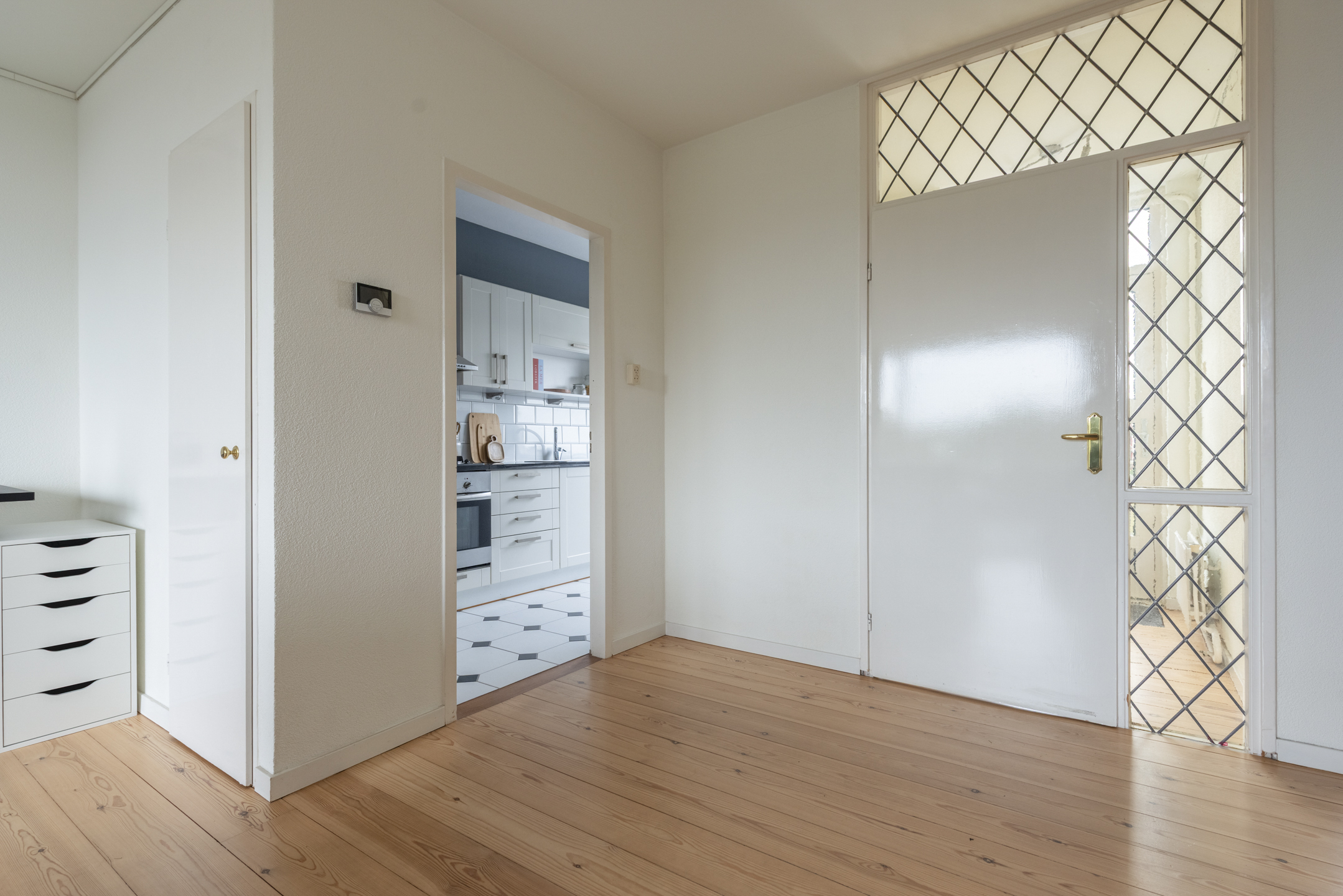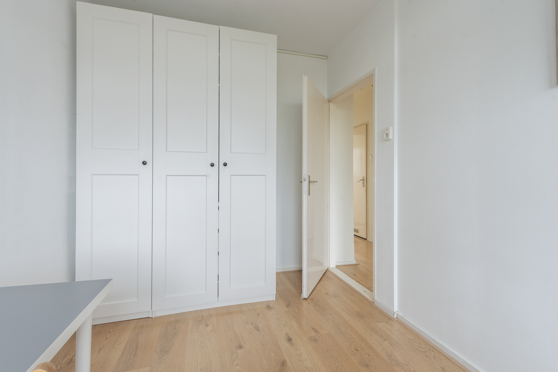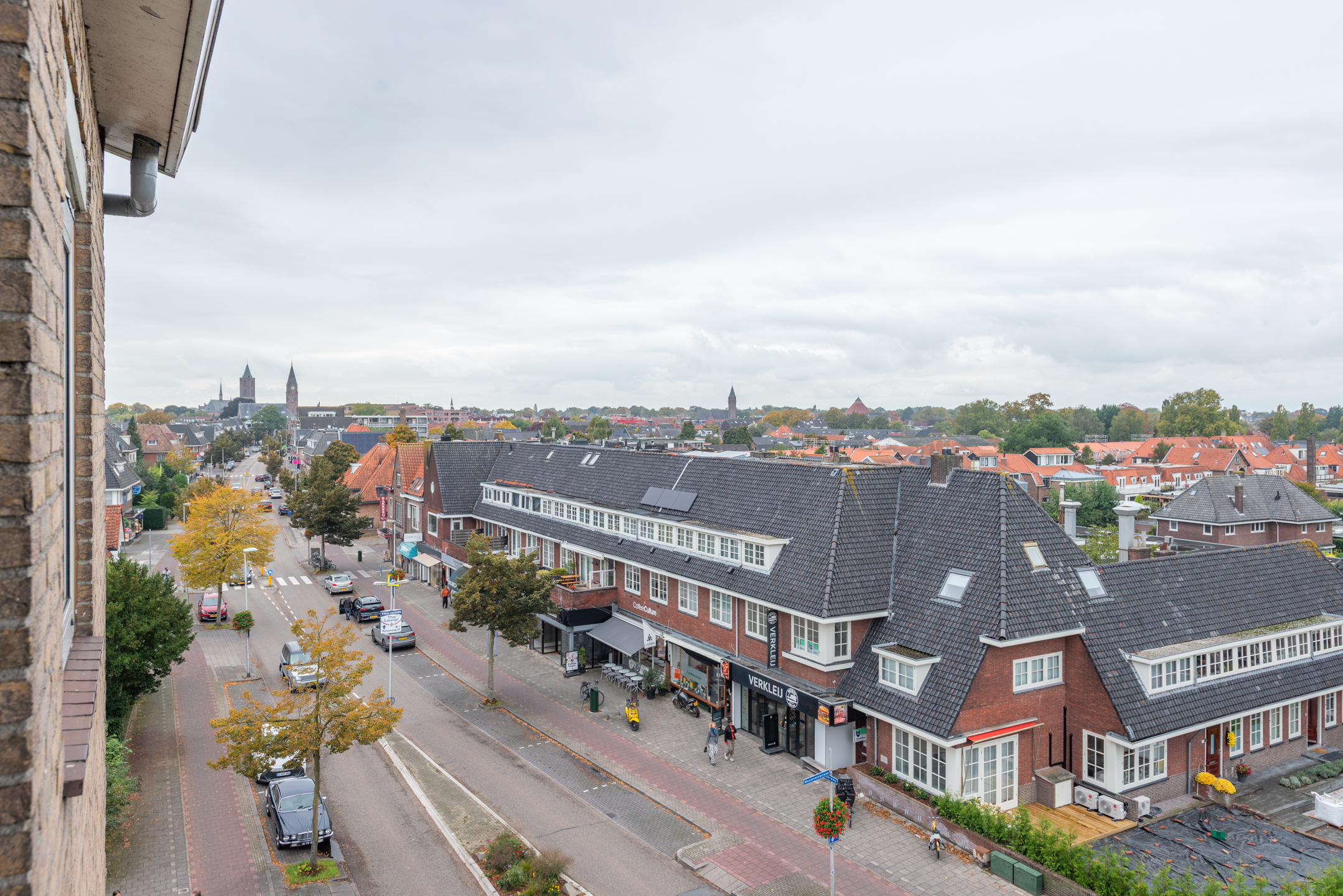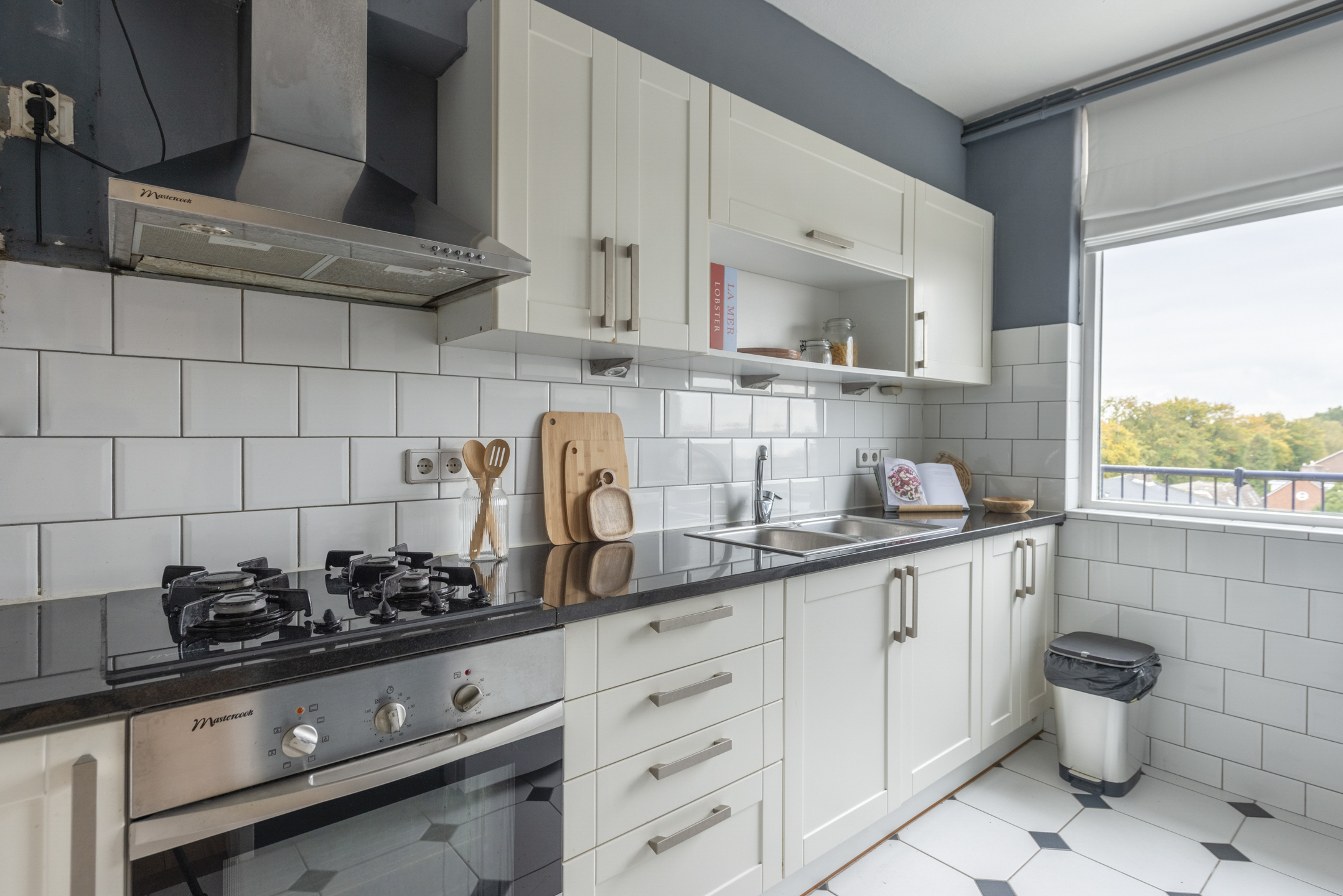 Dit ruime appartement ligt op het einde van de galerij op de vierde verdieping. Daardoor is het een heel lichte en ook een heel rustige plek. Vanuit de woonkamer en balkon kijk je uit over het groen van het Mouwtje en de boomtoppen van Bussum en Naarden, terwijl onder je de reuring van het centrum aan je voorbij trekt. Op de galerij kun je rustig op een bankje van de zon genieten.