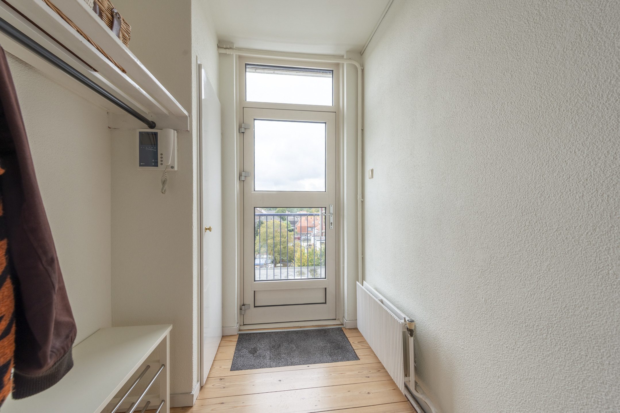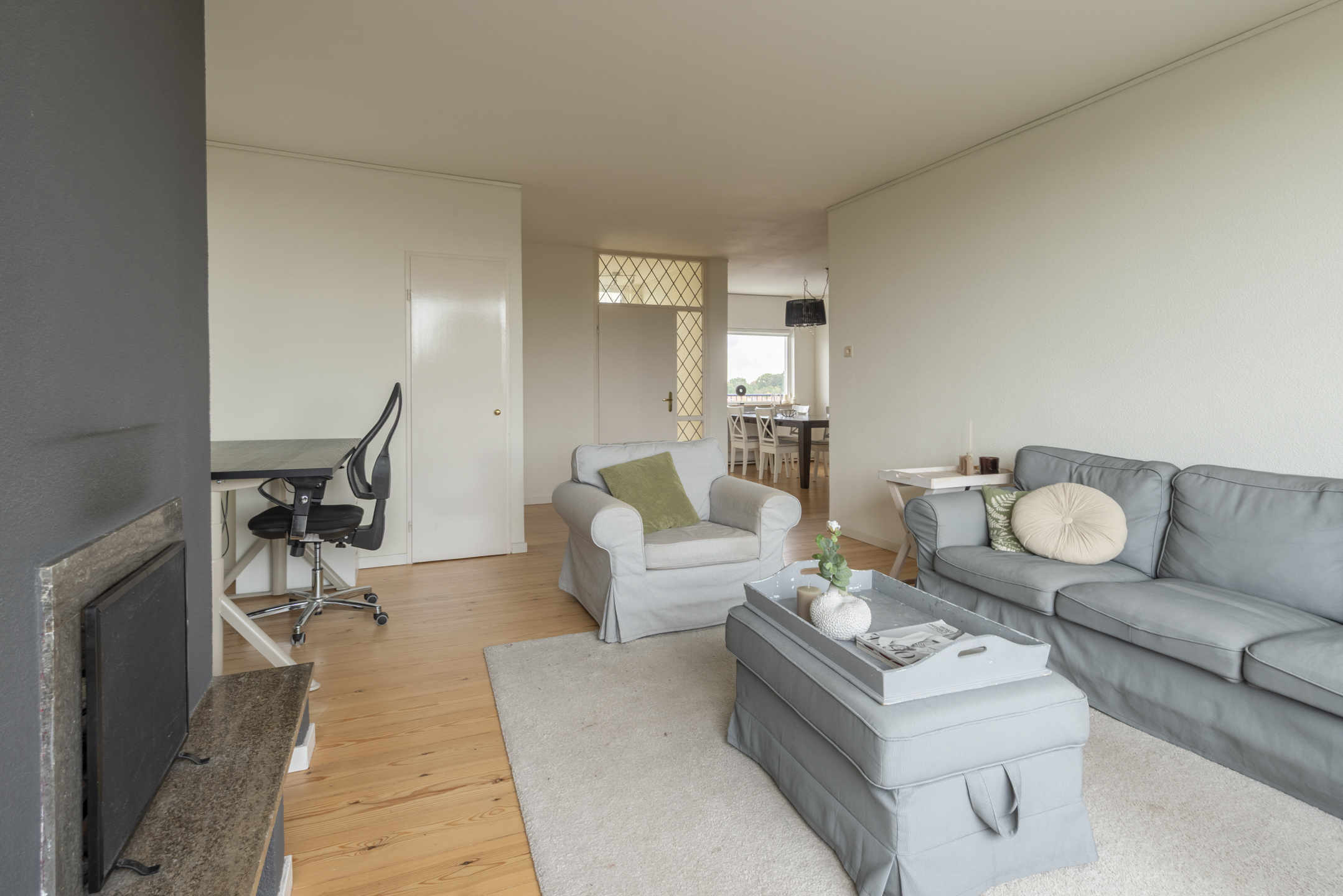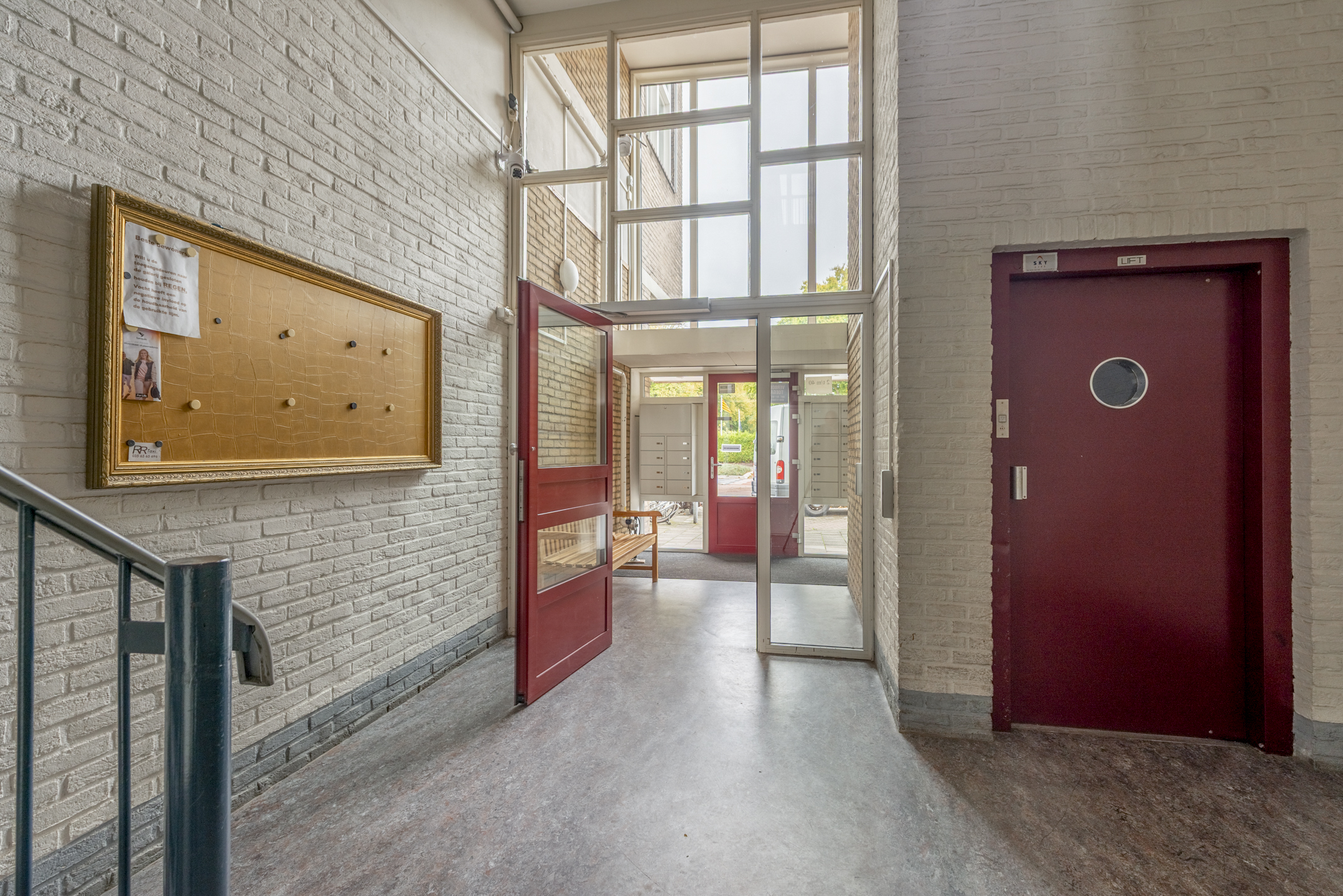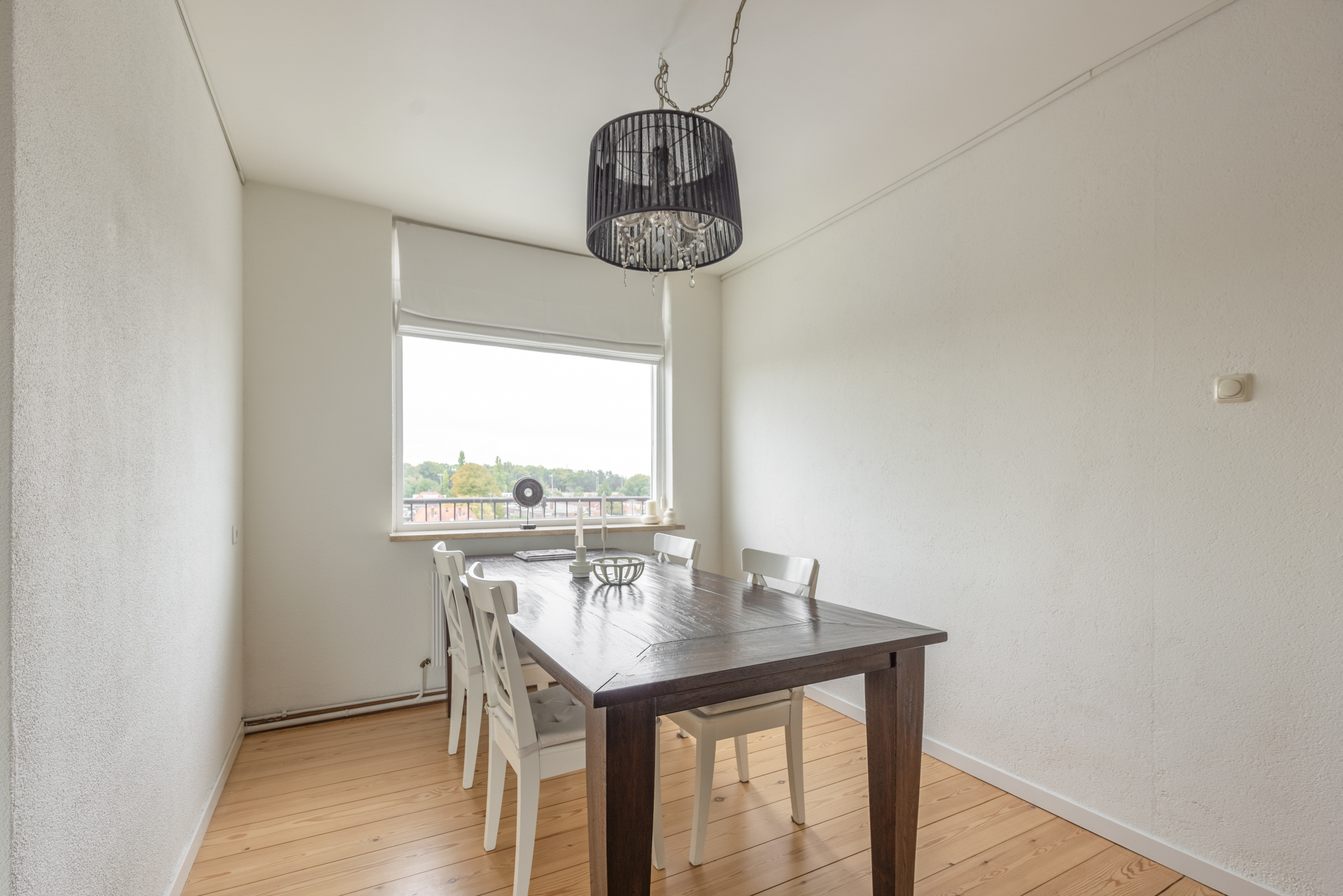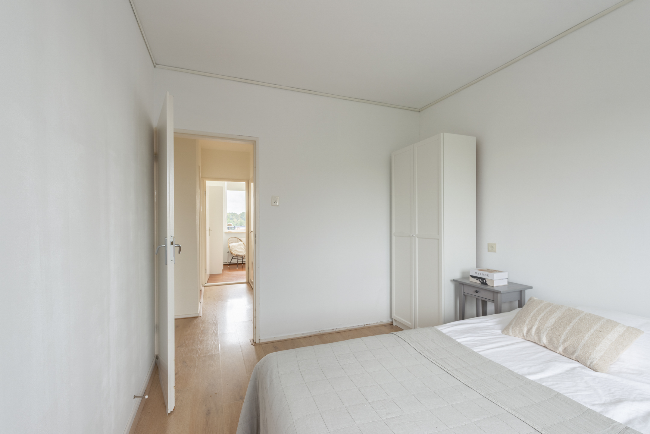 Dit ruime appartement ligt op het einde van de galerij op de vierde verdieping. Daardoor is het een heel lichte en ook een heel rustige plek. Vanuit de woonkamer en balkon kijk je uit over het groen van het Mouwtje en de boomtoppen van Bussum en Naarden, terwijl onder je de reuring van het centrum aan je voorbij trekt. Op de galerij kun je rustig op een bankje van de zon genieten.