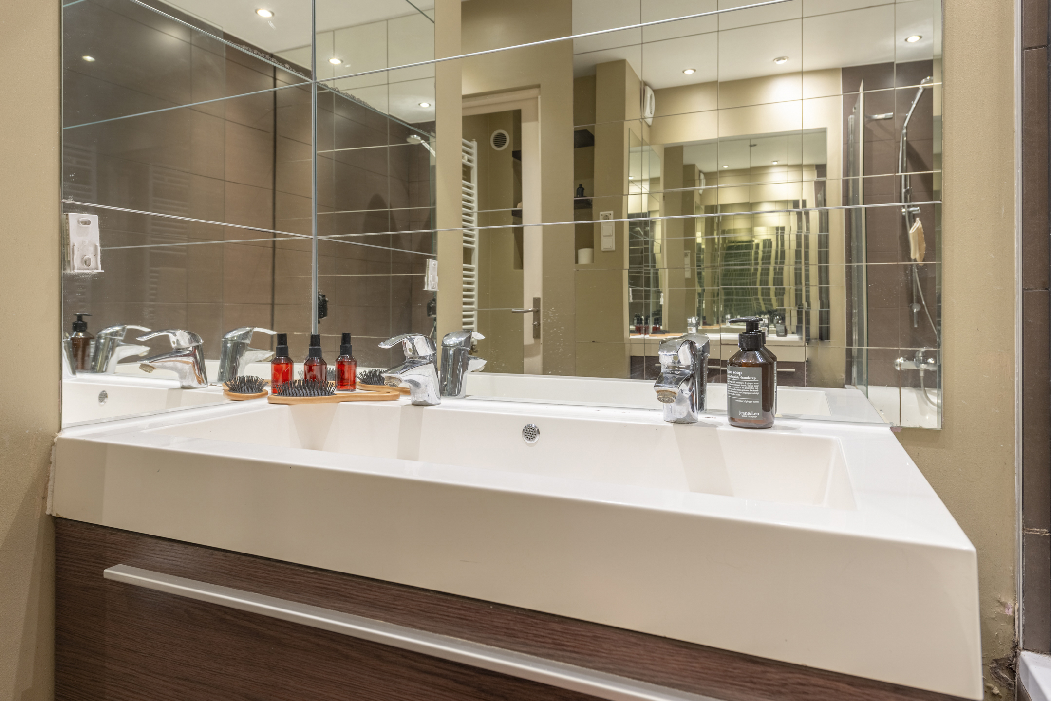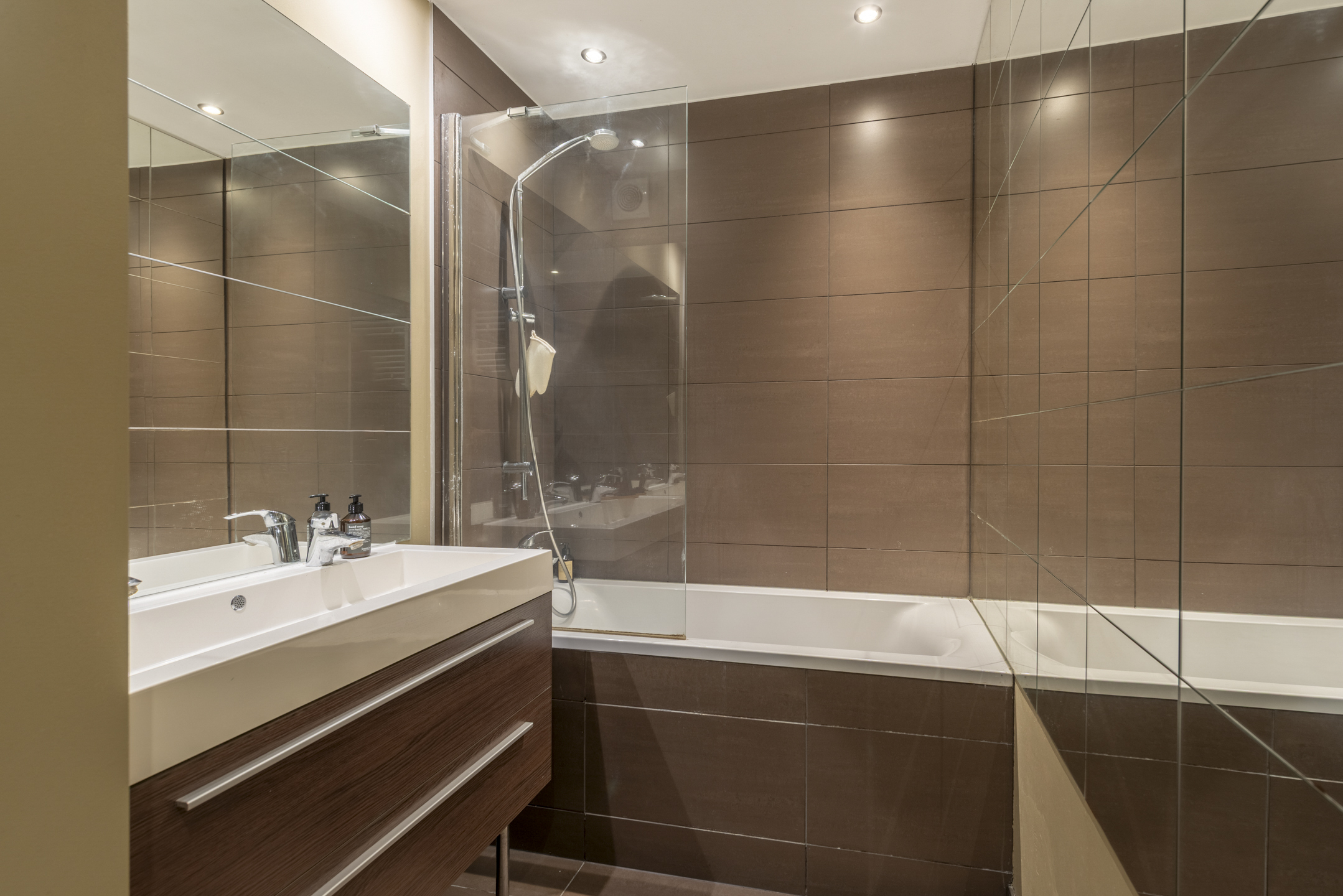 - Badkamer met ligbad, wastafelmeubel en toilet.